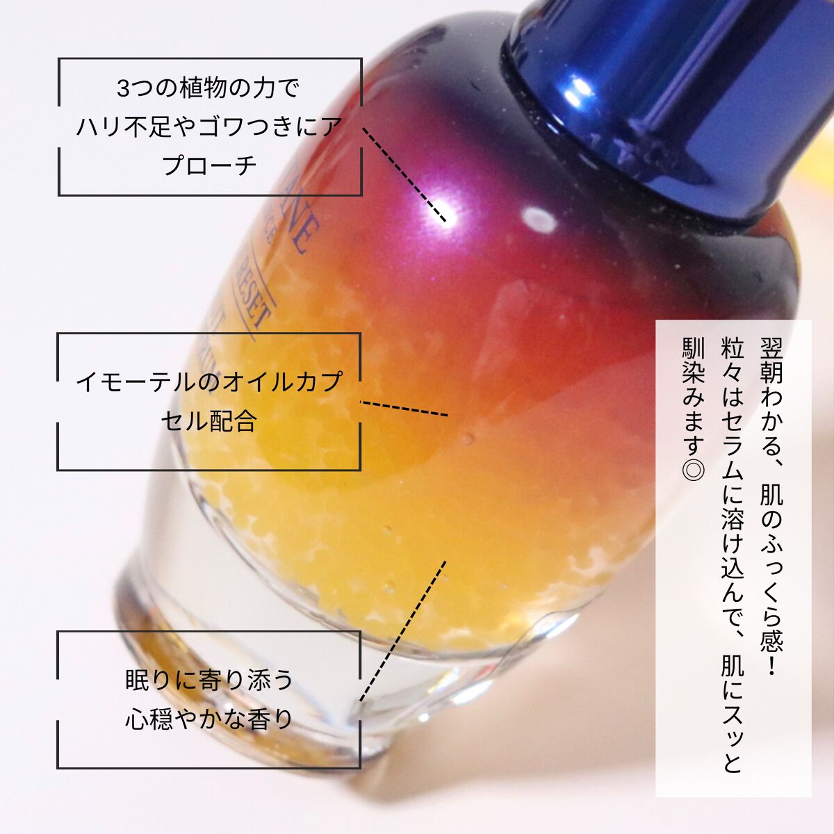 - 一日の肌ストレスを眠っている間にケアする夜用美容液が、永久花・イモーテルからの新成分「イモーテルディープエキス」と、従来品の10倍「イモーテルエッセンシャルオイル」を配合して、9/29にリニューアル! 紫外線や乾燥、寝不足など、肌が受けるストレスは様々。 パワーアップしたセラムは、肌の「ストレスサイクル」に着目。寝不足やストレスが続いても、夜のスキンケアに加えるだけで、翌朝、たっぷり眠ったかのようなハリとツヤに満ちた熟睡肌へ導きます。 オイルカプセルが弾けてセラムと溶け合うみずみずしいテクスチャーと、眠りに寄り添う心穏やかな香りで、気持ちもリセットしてくれそうな豊かなスキンケア時間に。 一日の終わりに夜の新習慣で、未来のエイジング不安からも解放し、使い続けるほどストレスに負けない肌へ。