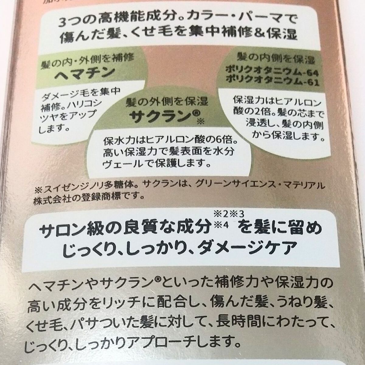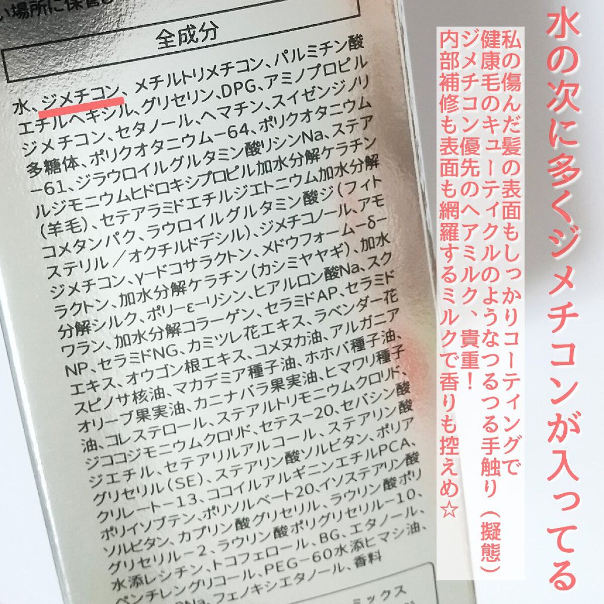 - <100g> 水、ジメチコン、メチルトリメチコン、パルミチン酸エチルヘキシル、グリセリン、DBG、アミノプロピルジメチコン、セタノール、スイゼンジノリ多糖体、ヘマチン、ポリクオタニウム-61、ポリクオタニウム-64、ジラウロイルグルタミン酸リシンNa、ジメチコノール、アモジメチコン、ステアルジモニウムヒドロキシプロピル加水分解ケラチン(羊毛)、γ-ドコサラクトン、メドウフォーム-δ-ラクトン、加水分解ケラチン(カシミヤヤギ)、加水分解シルク、セテアラミドエチルジエトニウム加水分解コメタンパク、ラウロイルグルタミン酸ジ(フィトステリル/オクチルドデシル)、ポリ-ε-リシン、ヒアルロン酸Na、スクワラン、加水分解コラーゲン、セラミドAP、セラミドNP、セラミドNG、カミツレ花エキス、ラベンダー花エキス、オウゴン根エキス、コメヌカ油、アルガニアスピノサ核油、マカデミア種子油、ホホバ種子油、オリーブ果実油、カニナバラ果実油、ヒマワリ種子油、コレステロール、ステアルトリモニウムクロリド、ジココジモニウムクロリド、セテス-20、セバシン酸ジエチル、セテアリルアルコール、ステアリン酸グリセリル(SE)、ステアリン酸ソルビタン、ポリアクリレート-13、ココイルアルギニンエチルPCA、ポリイソブテン、ポリソルベート20、イソステアリン酸ソルビタン、水添レシチン、トコフェロール、BG,エタノール、PEG-60水添ヒマシ油、EDTA-2Na、フェノキシエタノール、香料 <パウチタイプ(100g)> 水、ジメチコン、メチルトリメチコン、パルミチン酸エチルヘキシル、グリセリン、DBG、アミノプロピルジメチコン、セタノール、スイゼンジノリ多糖体、ヘマチン、ポリクオタニウム-61、ポリクオタニウム-64、ジラウロイルグルタミン酸リシンNa、ジメチコノール、アモジメチコン、ステアルジモニウムヒドロキシプロピル加水分解ケラチン(羊毛)、γ-ドコサラクトン、メドウフォーム-δ-ラクトン、加水分解ケラチン(カシミヤヤギ)、加水分解シルク、セテアラミドエチルジエトニウム加水分解コメタンパク、ラウロイルグルタミン酸ジ(フィトステリル/オクチルドデシル)、ポリ-ε-リシン、ヒアルロン酸Na、スクワラン、加水分解コラーゲン、セラミドAP、セラミドNP、セラミドNG、カミツレ花エキス、ラベンダー花エキス、オウゴン根エキス、コメヌカ油、アルガニアスピノサ核油、マカデミア種子油、ホホバ種子油、オリーブ果実油、カニナバラ果実油、ヒマワリ種子油、コレステロール、ステアルトリモニウムクロリド、ジココジモニウムクロリド、セテス-20、セバシン酸ジエチル、セテアリルアルコール、ステアリン酸グリセリル(SE)、ステアリン酸ソルビタン、ポリアクリレート-13、ココイルアルギニンエチルPCA、ポリイソブテン、ポリソルベート20、イソステアリン酸ソルビタン、水添レシチン、トコフェロール、BG,エタノール、PEG-60水添ヒマシ油、EDTA-2Na、フェノキシエタノール、香料