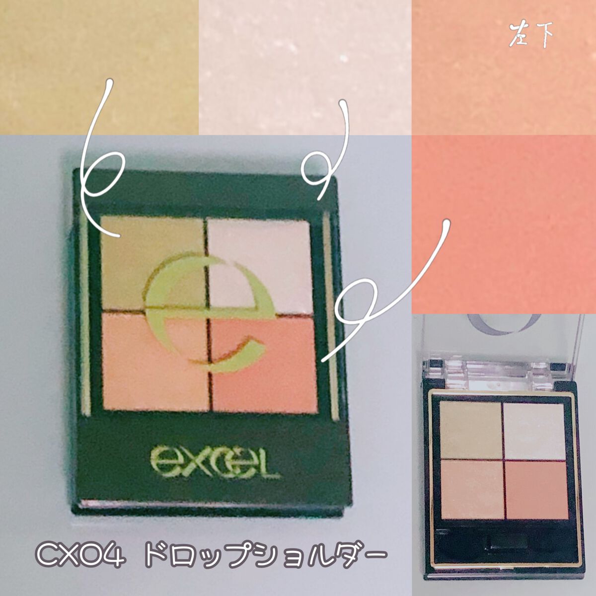 - 1.重ねてもくすまないクリアな発色。ナチュラルに溶け合う絶妙4カラー。 ツヤタイプ(左上・左下カラー):アイホール全体にぼかしたり、目尻へのポイント使いも。 ラメタイプ(右上カラー):アイホール中心や下まぶたにきらめきのアクセント。 マットタイプ(右下カラー):単色で陰影を付けたり、ツヤタイプと重ねてニュアンスをプラス。 2.うっとりするほどリッチな質感で粉飛びしないのに、軽いタッチで伸びて重ねやすいテクスチャー。 3.スクワラン(保湿)配合で目元の乾燥を防ぎます。 [PERFORMANCE] 色と質感の重ね着を楽しむ、ファッション感覚アイシャドウパレット [DESIGN] ・まぶたにひっかからない、なめらかな上質チップ ・薄型コンパクトだからポーチの中でかさばらない [QUALITY] 1.重ねてもくすまないクリアな発色 ナチュラルに溶け合う絶妙4カラー 2.パールの重ね技でまぶたに極上のツヤ感 微細多色 カラーパール 銀コーティング ガラスパール* excel GOLD-MIX処方(金パール配合)* (*右上のシャイニーカラーのみ) 3.うっとりするほどリッチな質感で粉飛び知らず!なのに、軽いタッチで伸びて重ねやすい 4.スクワラン(保湿)配合で目元の乾燥を防ぐ