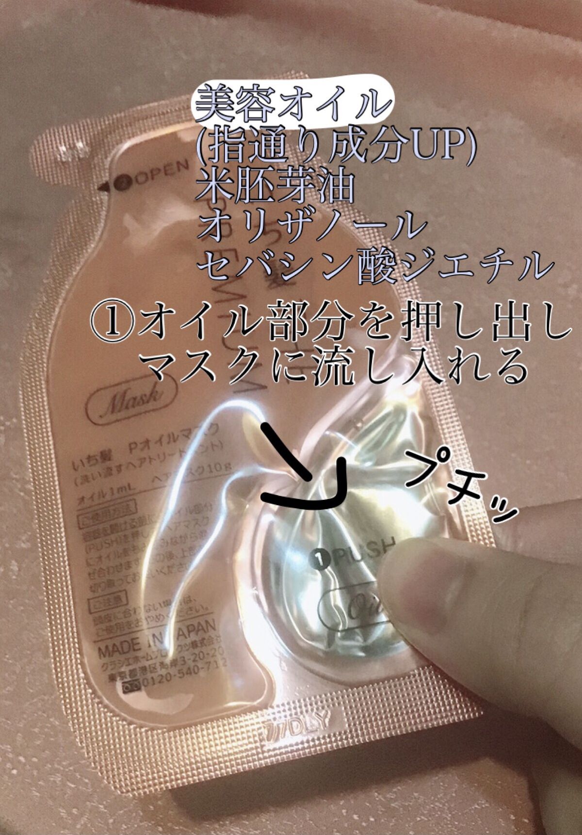 - ●「日本の髪を本質から考える。*1」ヘアケアブランド ●日本の髪研究の成果。アイロン等の熱ダメージによる乾燥髪のためのプレミアムダメージケアシリーズ ●今まで体験したことのない*2美容オイルを注入、混ぜるヘアマスク(洗い流すトリートメント) ●手触り、感動的。集中補修×オイルコートで、ヘアマスクとも、ヘアオイルとも違う体験で、つるんとした髪へ。 ●髪内部と外側をWでケアする「プレミアムWリペアシステム」 ・集中補修成分「高濃度*3米ぬか発酵導入美容液*4」配合のヘアマスクで、髪の内部を補修 ・指通りUP成分「和草・導入美容オイル*5」とドライヤーの熱を味方にキューティクルを密着する「ヒートリペアコート成分*6」で、髪の外側をコートして指通りをアップ ●つややかな八重桜の香り(天然桜エッセンス配合香料) ●サルフェートフリー(硫酸系界面活性剤不使用) ●合成着色料フリー *1:日本の風土や気候などの環境に合わせたヘアケア方法を研究しています。 *2:いち髪ブランド内 *3:いち髪 THE PREMIUM エクストラダメージケアトリートメント(シャイニーモイスト)比 *4:米ぬか発酵液、ハス種子発酵液、酒粕エキス、セバシン酸ジエチル、グリセリン *5:米胚芽油、オリザノール、セバシン酸ジエチル *6: γ-ドコサラクトン