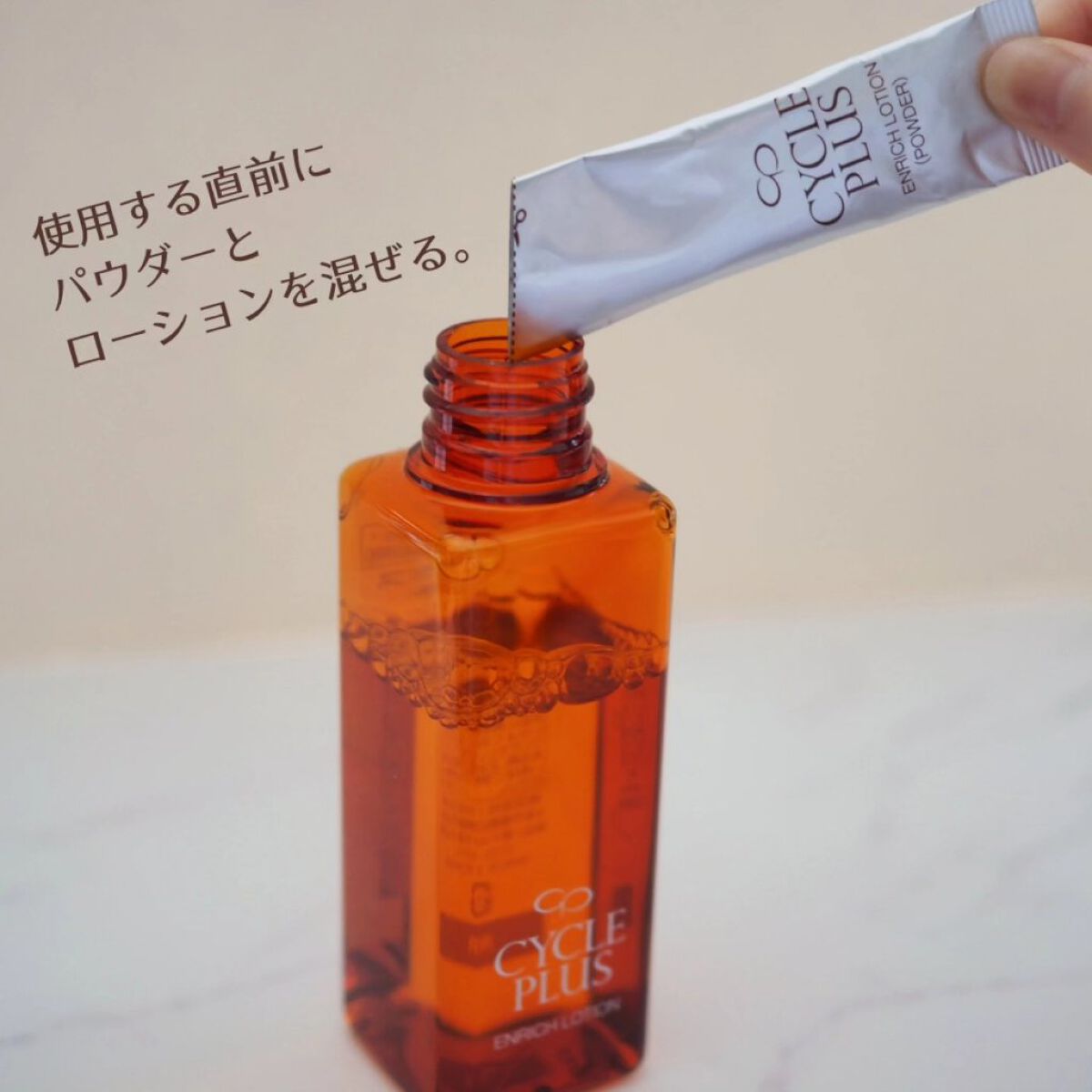 \\サイクルプラス//エンリッチローション新鮮かつ高濃度の高浸透型ビタミンC誘導体(APPS)*が角質層に浸透。潤い、ハリ、透明感のあるお肌へ✨ローションとパウダーを混ぜ合わせて、パウダーが溶けてから使う、使い切りの化粧水♫私がいただいたのは...