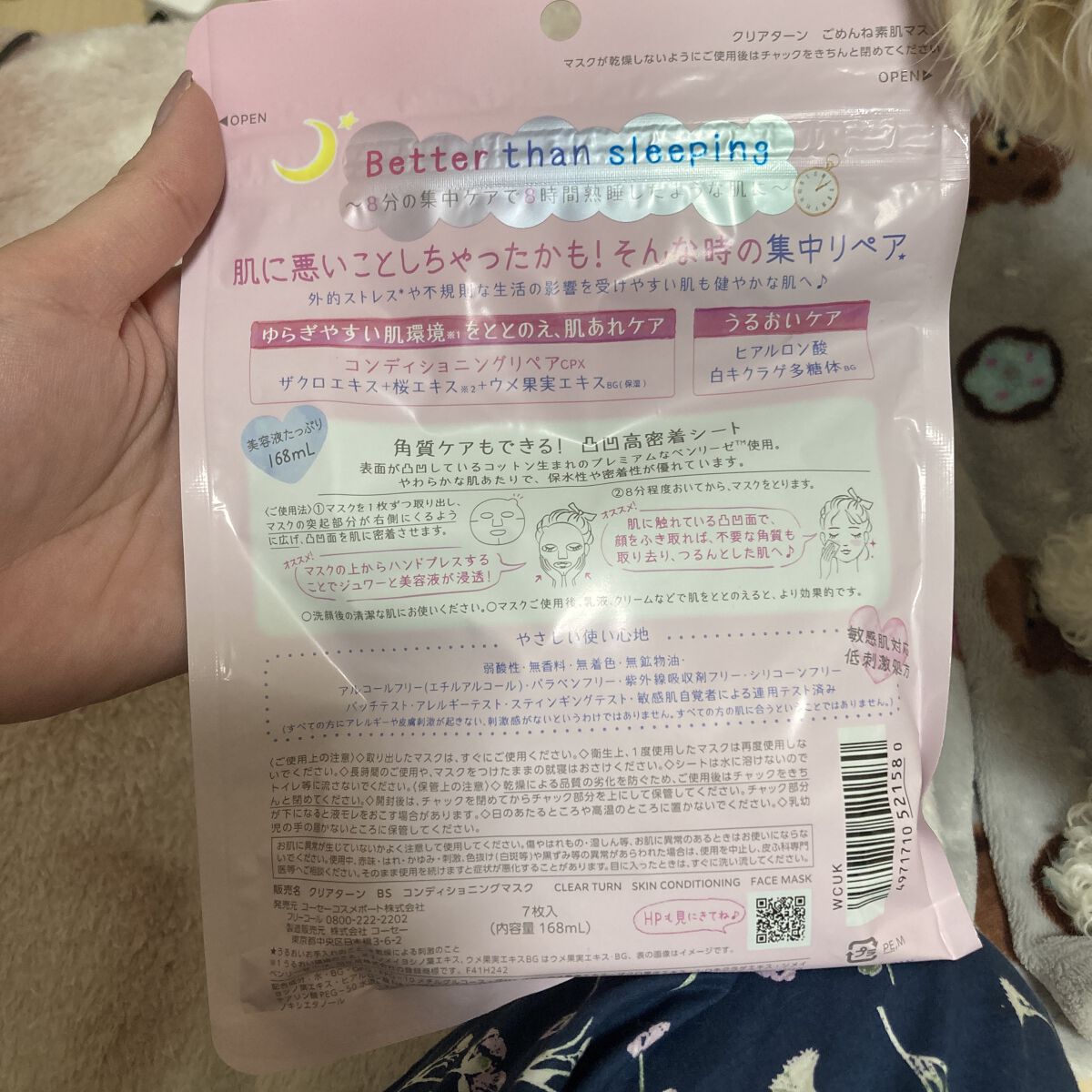 - 【クリアターン ごめんね素肌マスク】 負担をかけて、あれてしまった肌の素肌環境※1をととのえる“速攻集中リペア※2マスク”です。 ① あれがちな肌を素早くコンディションケア! ザクロエキス、桜エキス※3、ウメ果実エキスBG配合し、ゆらぎやすい肌環境をととのえ、肌あれをケアします。また、うるおいケア成分として、ヒアルロン酸、白キクラゲ多糖体BGを配合。外的ストレス※4や不規則な生活の影響を受けやすい肌も健やかでゆらぎにくい肌へみちびきます。 ②敏感肌も使える、弱酸性・低刺激処方 無香料・無着色・無鉱物油・アルコールフリー(エチルアルコール)・パラベンフリー・紫外線吸収剤フリー・シリコーンフリー・パッチテスト済み・アレルギーテスト済み・スティンギングテスト済み・敏感肌自覚者による連用テスト済み(すべての方にアレルギーや皮膚刺激が起きない、刺激感がないというわけではありません。すべての方の肌に合うということではありません。) ③角質ケアもできる!凸凹高密着シート コットン生まれのやわらかな肌触りのベンリーゼを使用。 表面に凸凹のエンボス加工を施しているため、密着性が高く、はがしたマスクでやさしく顔をふきとることで角質ケアもできます。 ※1 うるおい環境のこと ※2 うるおいお手入れのこと ※3 ソメイヨシノ葉エキス、ウメ果実エキスBGはウメ果実エキス・BG(保湿) ※4 乾燥による刺激のこと