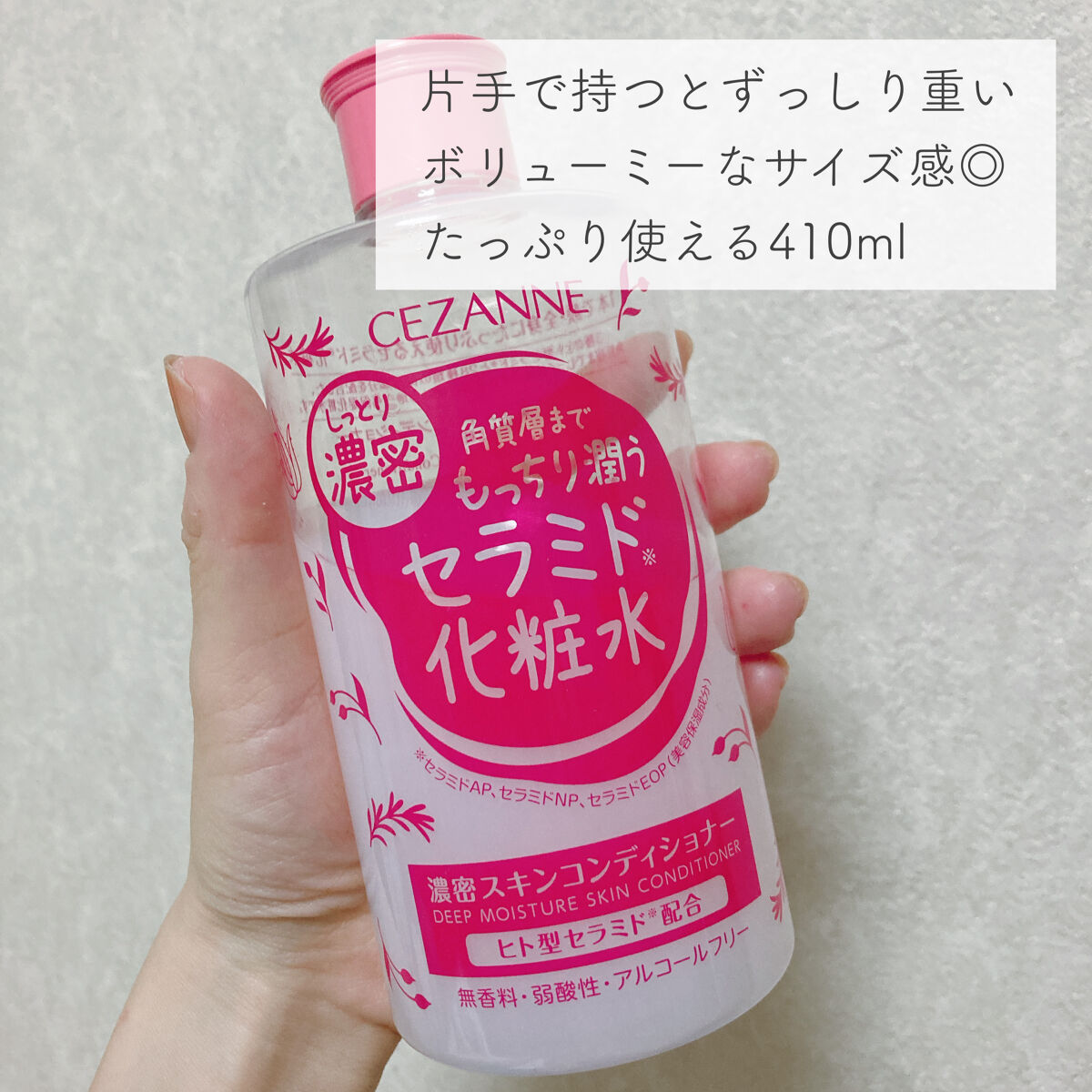- “ヒト型セラミド”(保湿成分)を増量配合!たっぷり使える濃密保湿の化粧水。 人間の角質層に存在するセラミドとよく似た化学構造で、保湿力や浸透力に優れている「ヒト型セラミド」を、従来品※から配合量をアップしました。べたつかずしっとりと保湿し、もっちり肌に整えます。 ※セザンヌ スキンコンディショナー高保湿 ヒアルロンやコラーゲン、アミノ酸などの美容保湿成分が28種類配合されており、うるおいを守ります。410mLの大容量でたっぷり使えるのでお風呂上りの顔はもちろん全身保湿ケアやコットンパックにもおすすめです。 ■3種のヒト型セラミド※とヒアルロン酸Na、ハトムギ種子エキスなど28種類の美容保湿成分配合。 ※セラミドAP、セラミNP、セラミドEOP(美容保湿成分) ■4つのフリー処方(無香料・無着色・無鉱物油・アルコールフリー) ■弱酸性