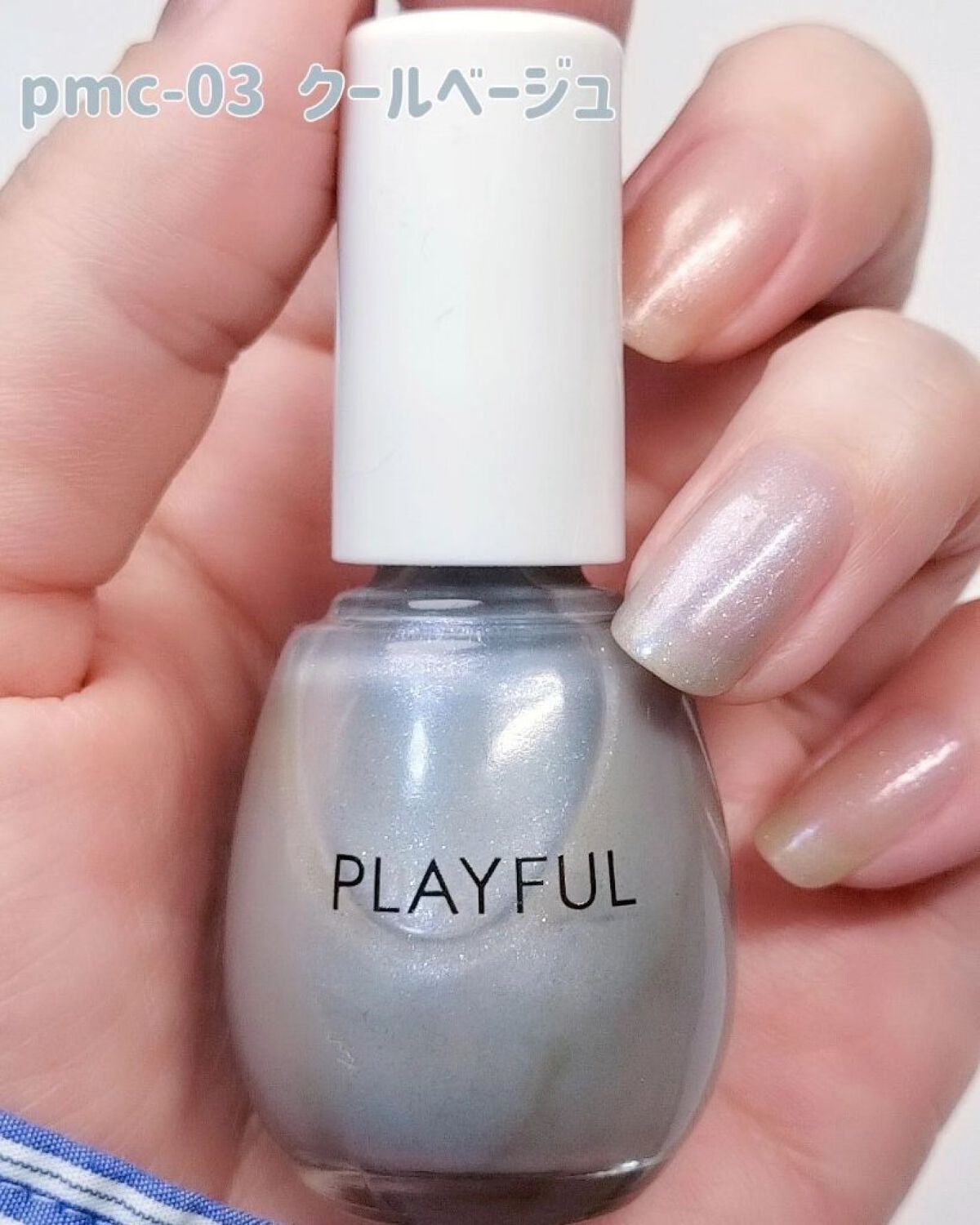 ベースもトップも不要、これだけでつやつやになります👍 どれもほのかな色付き&繊細ラメでいい女度が一気に上がる💕 pmc-01 ヌーディベージュ グレージュにピンクパープルラメ😍 上品で知的な印象なります。 pmc-02 レディベージュ(限定) イエベの私にはこの色が一番なじみました😊 自然な血色感とツヤが指先に乗ってヘルシーに見えます。 pmc-03 クールベージュ グレーみのある落ち着いたブルーラメです✨ 3色の中では一番色が濃く乗ります。このままでも可愛いけど、ニュアンスに活躍してくれそうな色😋