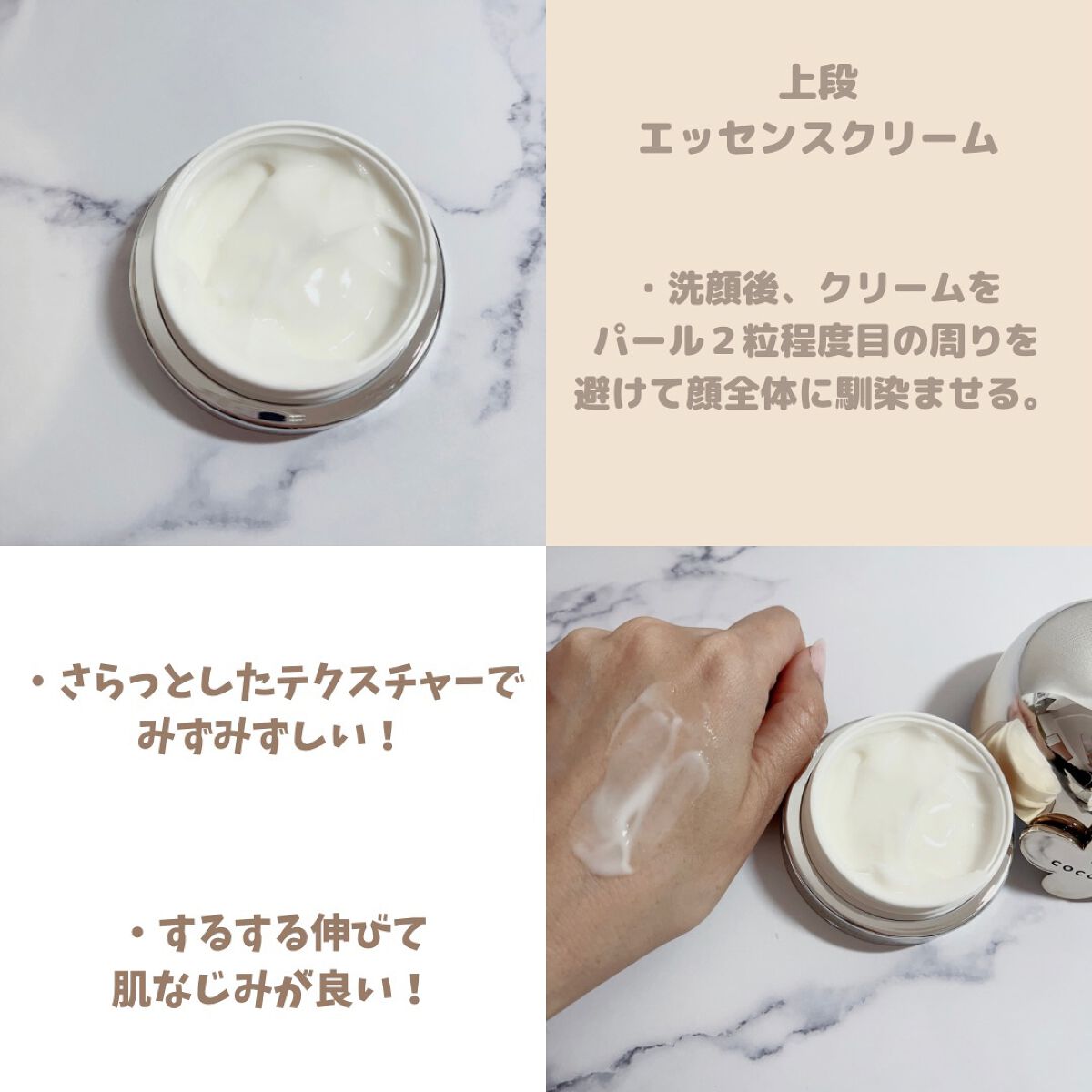 - 水分クリームマスク。クリームとマスクの2ステップで、それぞれに配合された美容保湿成分をお肌に与えます。いつものお手入れに加えるだけで、これまでにはなかったエイジングケア*を。*年齢に応じたお手入れ クリームマスク 90g(下段)/クリーム 20g(上段) 販売名:ココチ フェイシャル エッセンス クリームマスク ココチ リッチ エッセンス クリーム