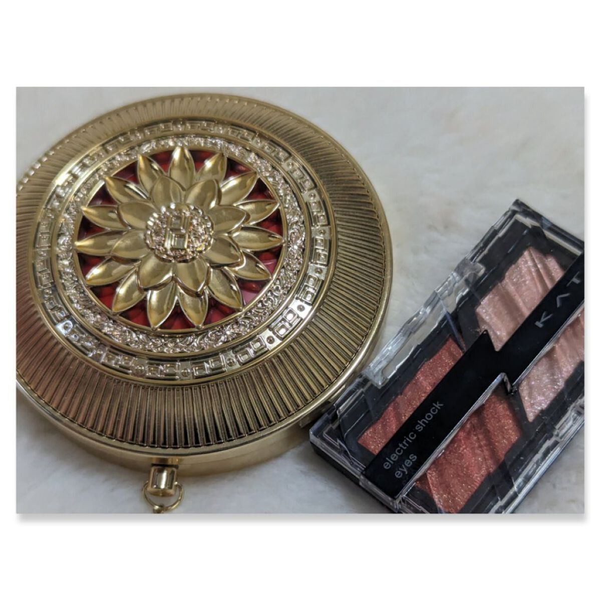 お値段間違えてるよ!な見た目 金の繊細なデザイン、中にはミラー付きって実用性あり またコンパクト専用の布袋付き 3色パレットはチーク以外もアイシャドウやハイライトにも使える万能さ 贈り物にもぴったりです