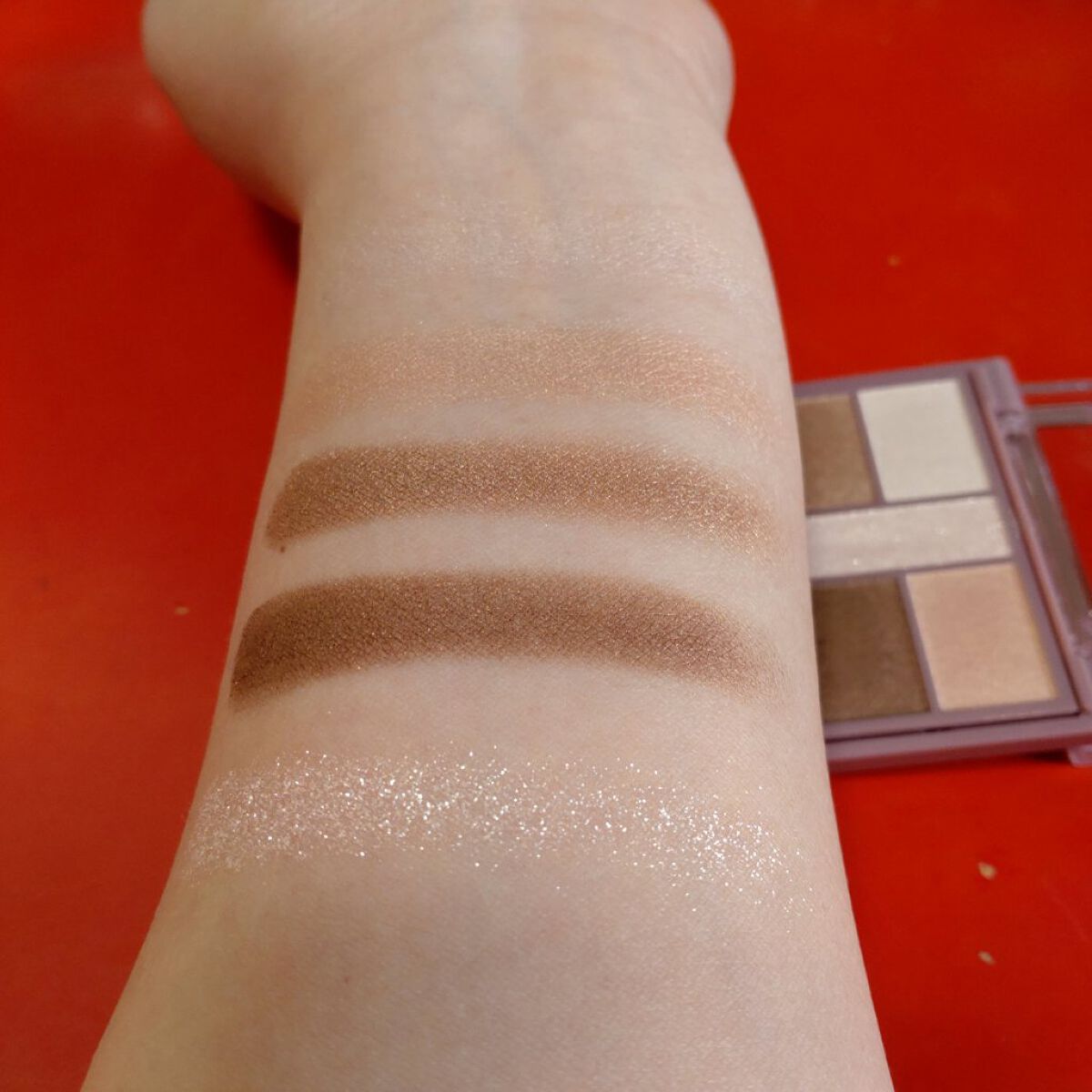 プチプラのクオリティじゃないっ!! 発売前からチェックしていたけれど、ここまで可愛いとは…😆 絶妙カラーで目もとのくすみを飛ばして*明るい印象に🩷 横割りグラデーションでメイクし、立体感をより出したかったので最後に1番左のカラーを上まぶたの真ん中と涙袋にのせています🙆 肌馴染みも良くて粉飛びも感じにくかったです💕 ブラウンの方も店頭に出てたら買おうかな💓