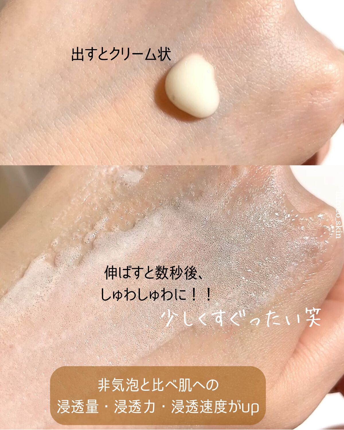 | 柔らかい乳液のようなテクスチャーのエッセンスをお肌に塗ると、たちまちしゅわしゅわと泡が出る…!! | 詳細を見る | |||