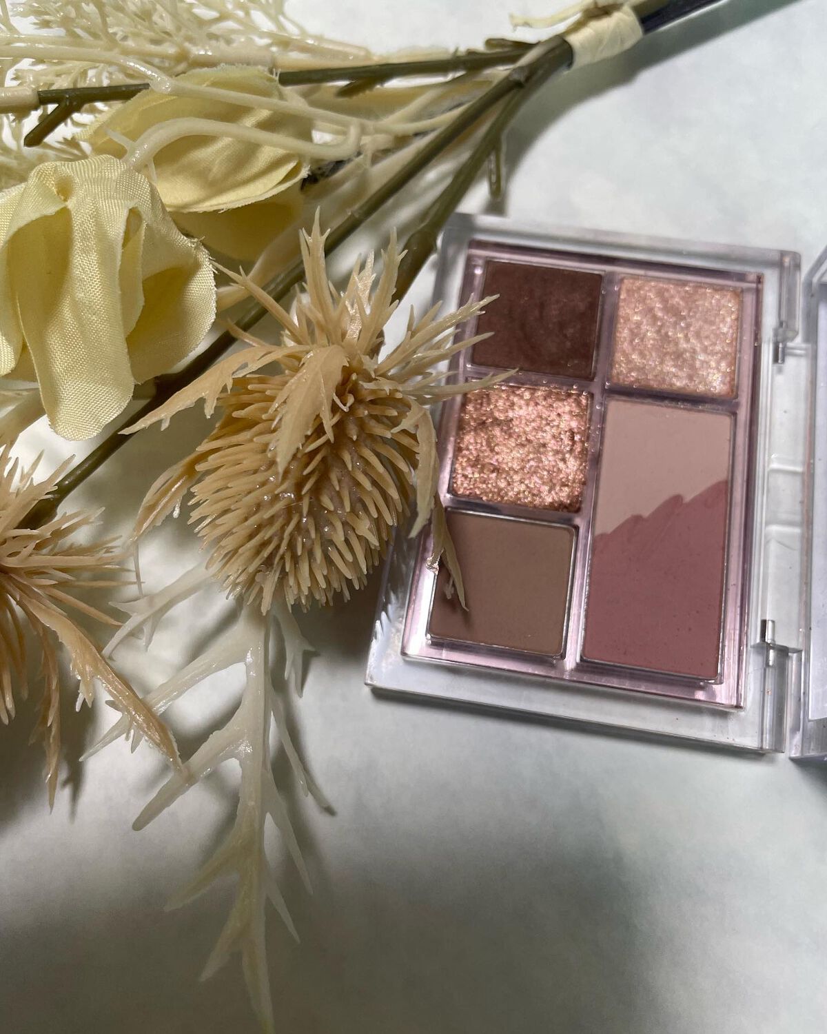 - 同系色陰影カラーと上品でクリアなグリッターの組み合わせの必要なカラーだけ詰め込んだミニアイパレット!