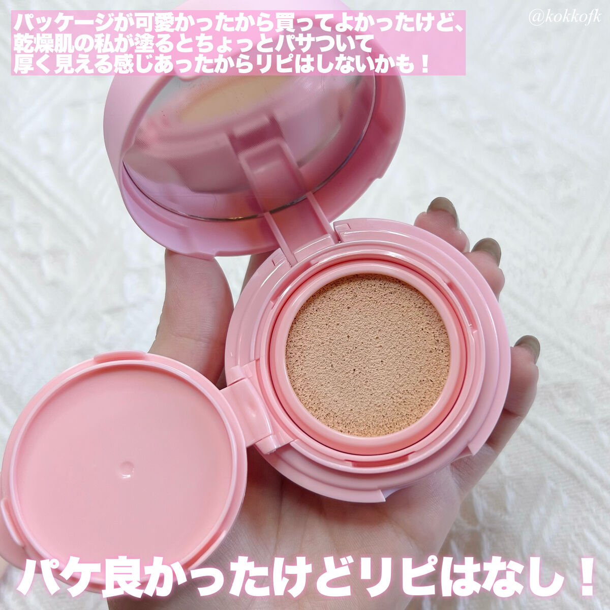 ビーガンのクッションファンデなの🙈 前から可愛いなぁって思ってて、評判も良いから購入🌸 カバー力はかなり高め!! しっかりメイクしたい日にオススメ🥹 ノンケミカル、パフには抗菌効果がついてて機能的! ベタつかないけど乾かないし軽いのにハイカバー、中々良いよ😭🩷🩷