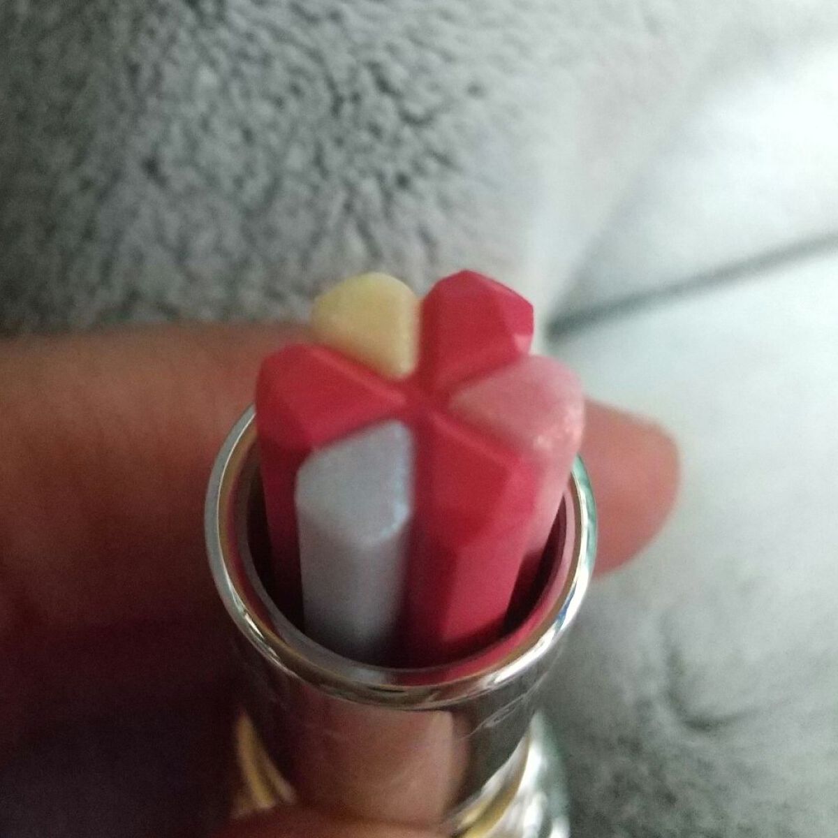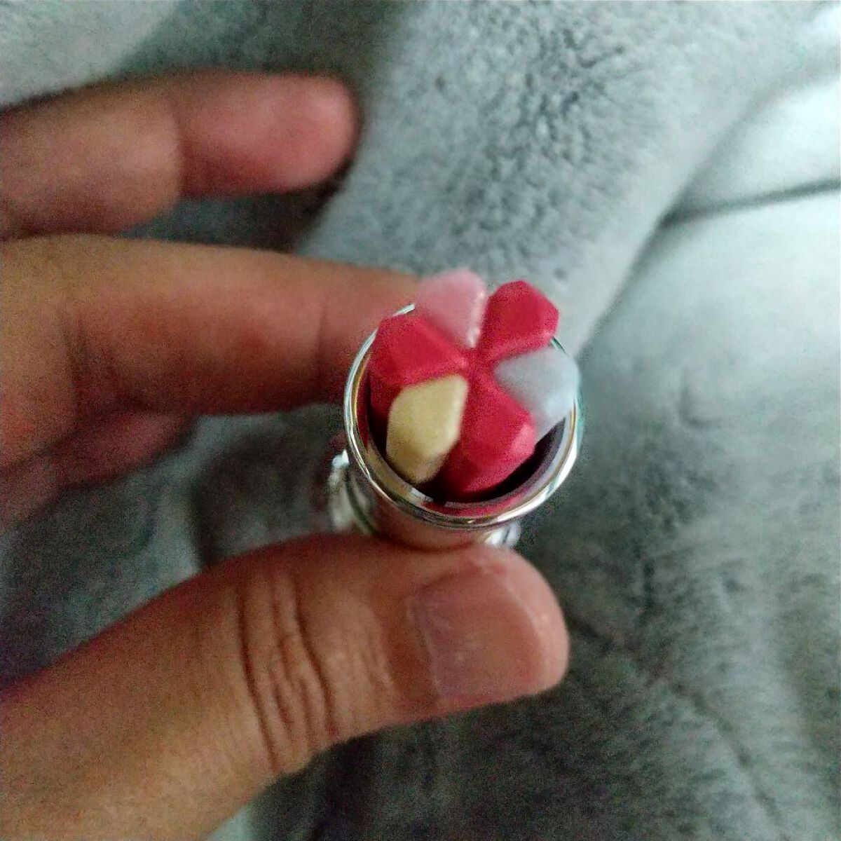 左上、左下、真ん中上、真ん中下、右上、右下という順番でスウォッチしてみました。 出してみると商品の写真より肌にのせたほうがくすみが出るかな✨という印象です😌 伸ばしやすくて指でも筆でもつけやすいです☺️💕 とっても可愛いカラーなのでオススメです💠