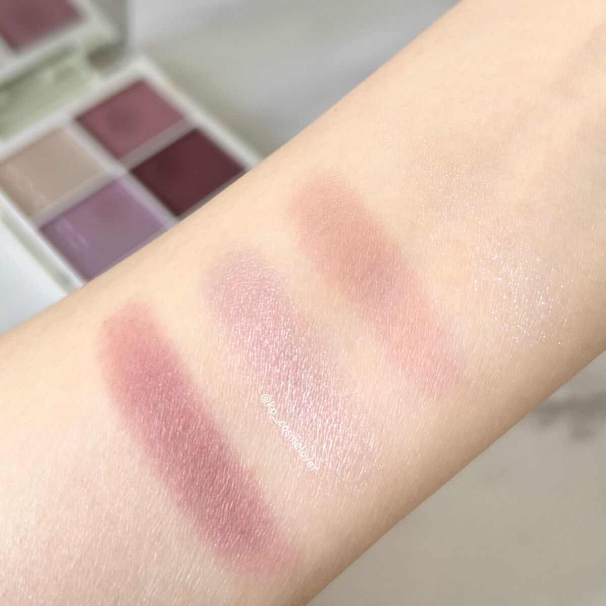 こちらは日本では店頭販売されていなかったので、色味を確認出来ず購入を躊躇していたのですが、先日PLAZAで限定のミニサイズが発売されて💓 手元で色味を確認したところ、好みドンピシャでした😍😍 ミニサイズを買うつもりでいたのですが、あまりに色味が気に入ったので通常サイズをAmazonでポチりました😇 くすみはあまり得意ではないですが、このパレットのくすみ具合はちょうど良いです✨ そして何よりラメが可愛い😭ピンクやイエロー、ブルーの多色ラメがキラッキラです🥺 rom&ndのアイテムは初めてでしたが、粉飛びやラメ落ちもなく、持ちも良くて最高でした🤤