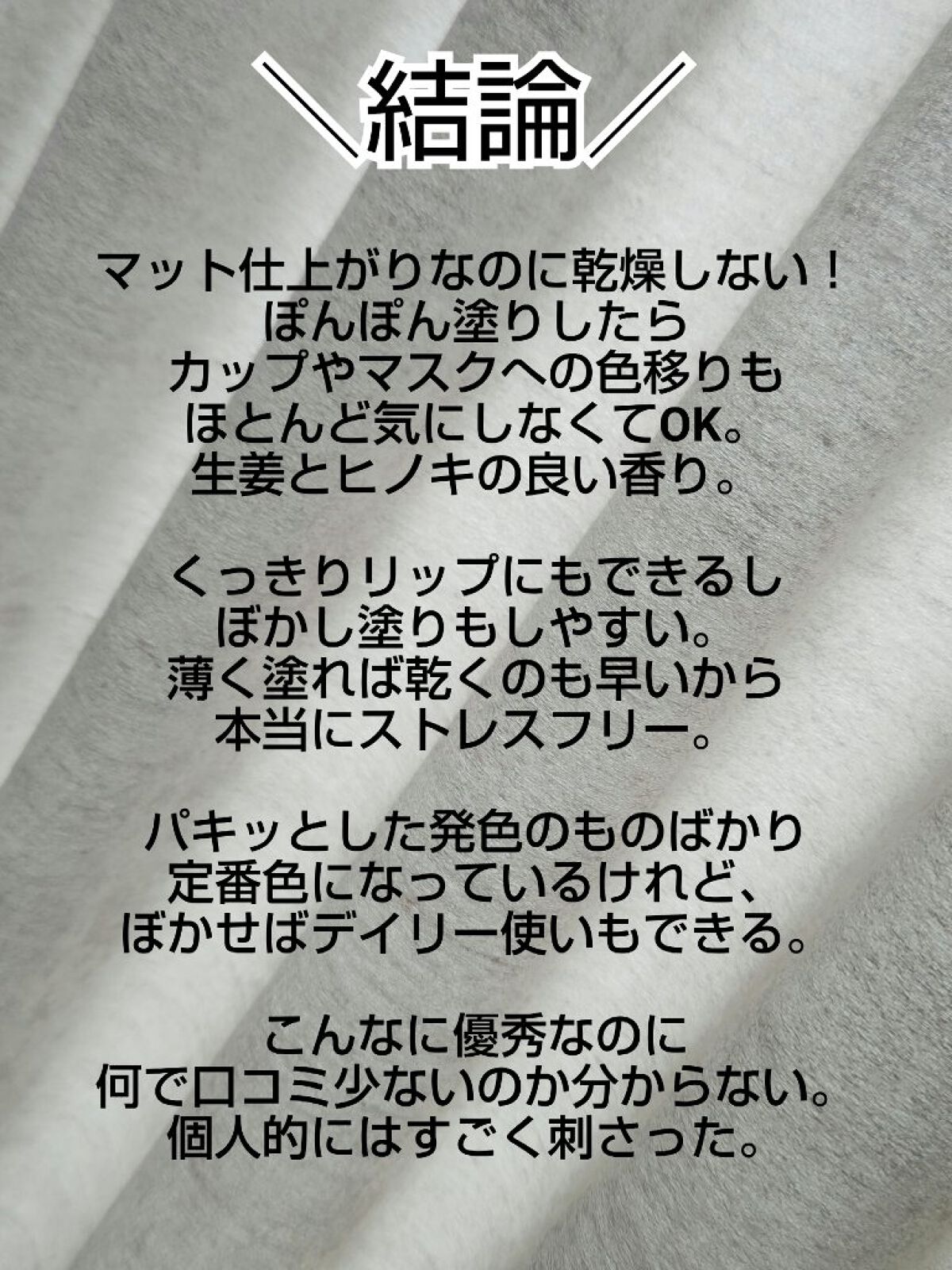 塗り心地は軽くなめらかでリップクリームのよう。 塗って少しおくかティッシュオフ→塗り直しを何度か繰り返すと落ちにくいしマスク移りしにくくて重宝します。 水にもこすれにも強いのにクレンジングではするっと落ちる。 ティントじゃないのにこの色持ち。すごい! 同じ処方同士なので違う色のリップモンスターを重ね塗りしやすいのも楽しい。 違う色のリップモンスターを混ぜるのをミックスモンスターって言うんですって。 可愛いネーミングもたまらない。