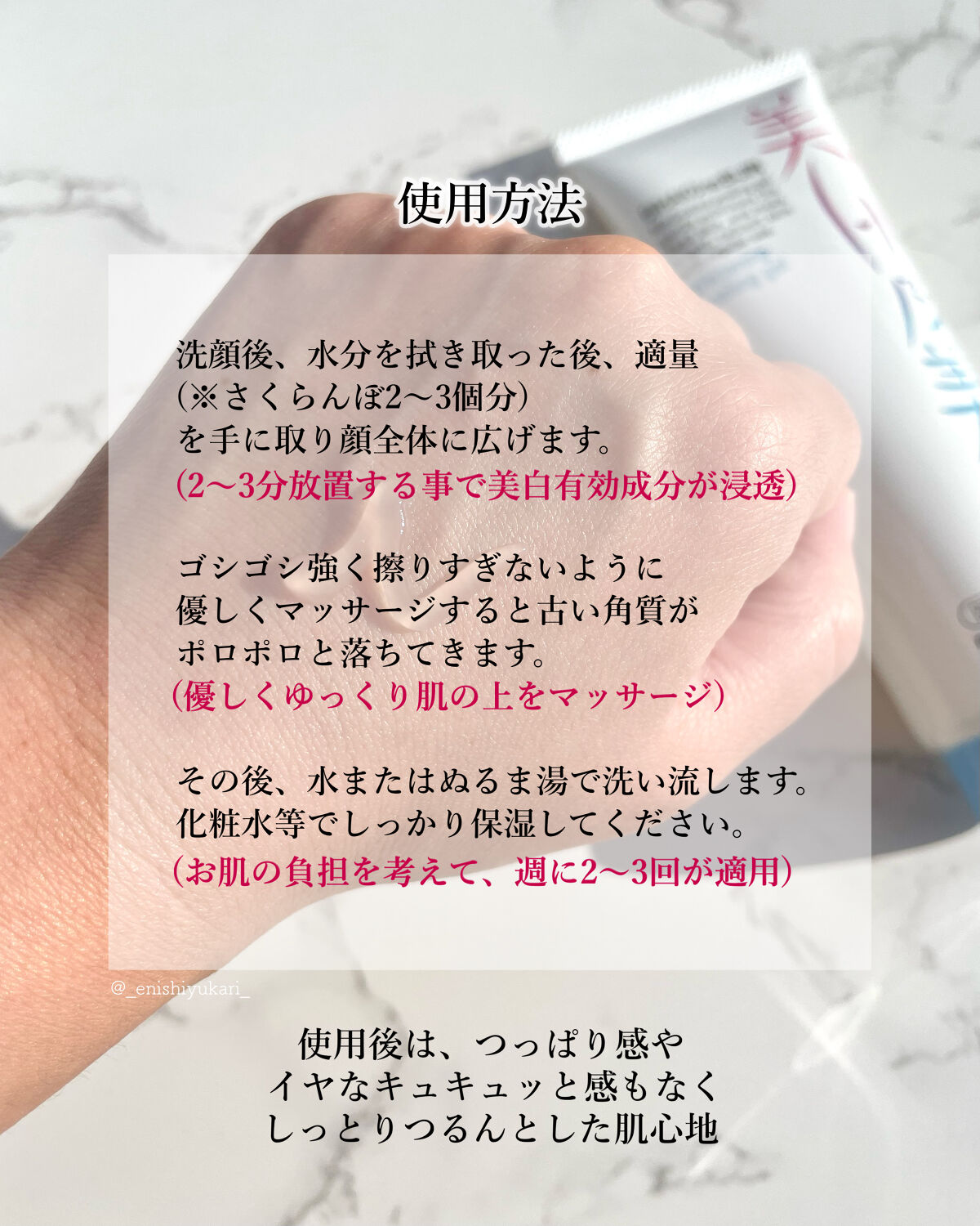 - 美白※1しながら肌トラブルケア。肌表面の古い角質を絡めとることに加え、2つの有効成分※2が美白※1ケアに肌あれ予防※3までアプローチする薬用角質ケア製品です。 古い角質が溜まるとスキンケアの浸透を妨げ、肌のくすみ※4やざらつき、肌トラブルの原因となります。古い角質を取り除くことで、スキンケアが浸透※5しやすい、明るく透明感のある肌※6に導きます。 肌のことを考えて、6つのフリー処方※7とパッチテスト※8も実施、また吸着成分としてポリマーの代わりに米デンプンを使用、古い角質や皮脂汚れを絡めとる際の肌への負担を軽減しました。 ※1メラニンの生成を抑え、シミ・そばかすを防ぐこと ※2水溶性プラセンタエキス、グリチルリチン酸2K ※3肌あれ、あれ性、ニキビを防ぐ ※4古い角質による ※5角質層まで ※6古い角質を洗い流すことによる ※7パラベン・エタノール・鉱物油・シリコーン・紫外線吸収剤・合成着色料・酸化防止剤 ※8全ての方に皮膚刺激が起こらないという訳ではございません