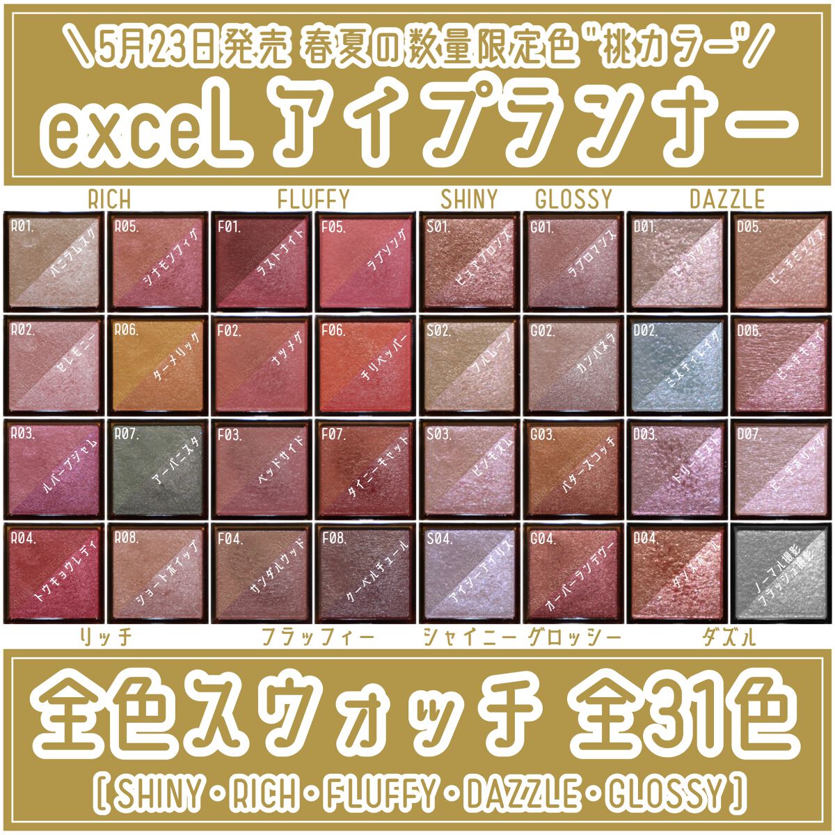 S[SHINY]“高輝度ガラスパール×カラーパールの美しいきらめき”↓S01.ピュアブロンズ“上品に艶めくブロンズゴールド” R[RICH]“リッチな高発色と繊細なツヤで色遊びを楽しめる”↓R01.バニラムスク“光を集めるハイライトベージュ” F[FLUFFY]“ふんわり・しっとりの新感覚 肌と同化するセミマット”↓F01.ラストナイト“血色感を潜ませるメロウなピンク”