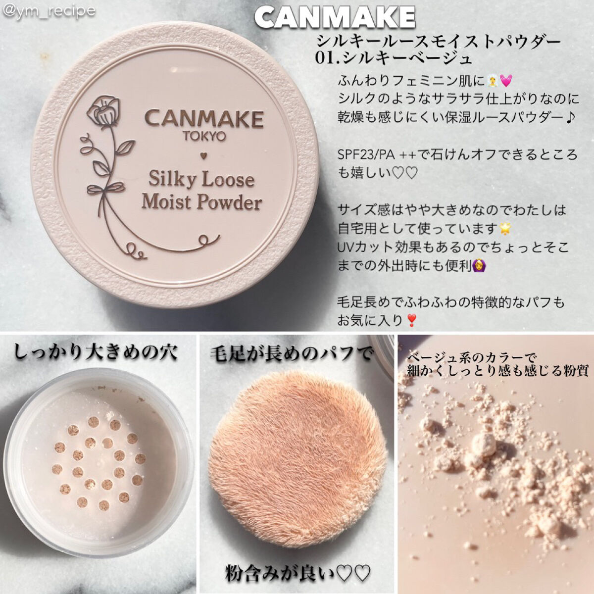 【使った商品】キャンメイクシルキールースモイストパウダー01 シルキーベージュ【商品の特徴】素肌キレイ見え!シルク肌仕上がり!乾燥による化粧崩れを防ぐ、保湿ルースパウダー石けんでオフOK(単品使用時)、SPF23・PA++、27種の美容液成分...