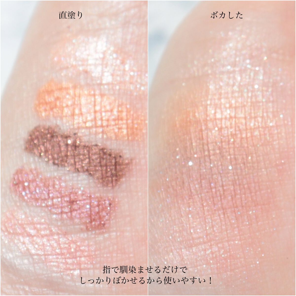 シマー、プリズム、マットそれぞれの質感でツヤと立体感を演出してくれるアイシャドウ✨ ツヤツヤ綺麗な青みピンク。シルバーとピンクのラメが綺麗なグリッター。ほんのりグレーがかったブラウン。ほんのり赤みを感じるツヤツヤモーヴブラウン。この組み合わせが絶妙すぎる🥹❤️❤️ 濃くないのにしっかり目元に印影が出て彫りが深く見えてめちゃくちゃ盛れる!!メイクしながら声が出たくらい盛れる!!! しっとりした粉質で粉飛びせずひと塗りでしっかり色が乗ってくれてお値段以上の質の良さで最高だった🫶🏻