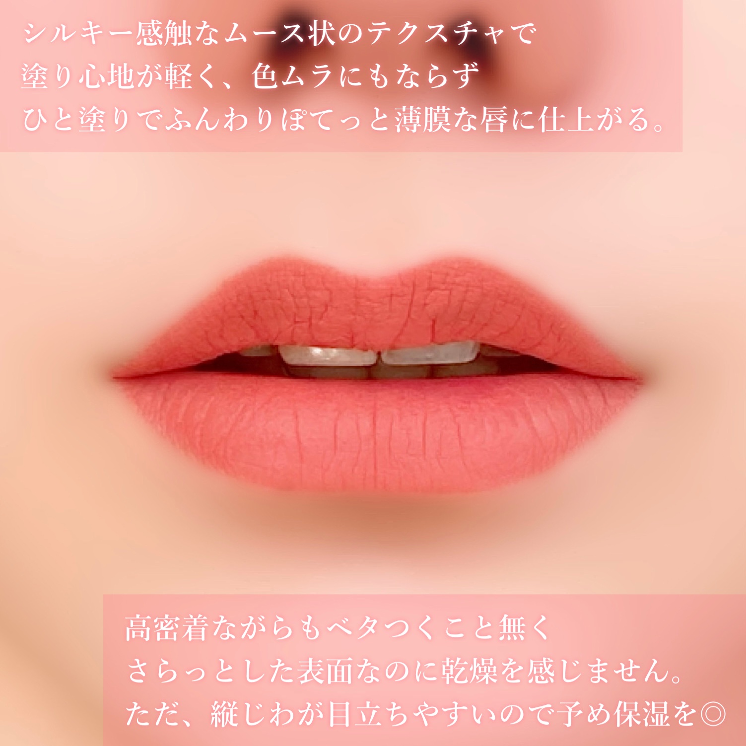 - 「温度を感じる、厚みの唇。」 雲タッチな質感×ティント処方×保湿成分配合の"1本3役のマットリップ" シルキー感触のむっちりふわふわ雲ティントで、唇に柔らかく密着するのにべとつかない。 保湿美容成分(植物性オイル配合)でしっかり潤いをキープしながら表面を揮発させ「乾燥しずらいのにマットな質感」に。