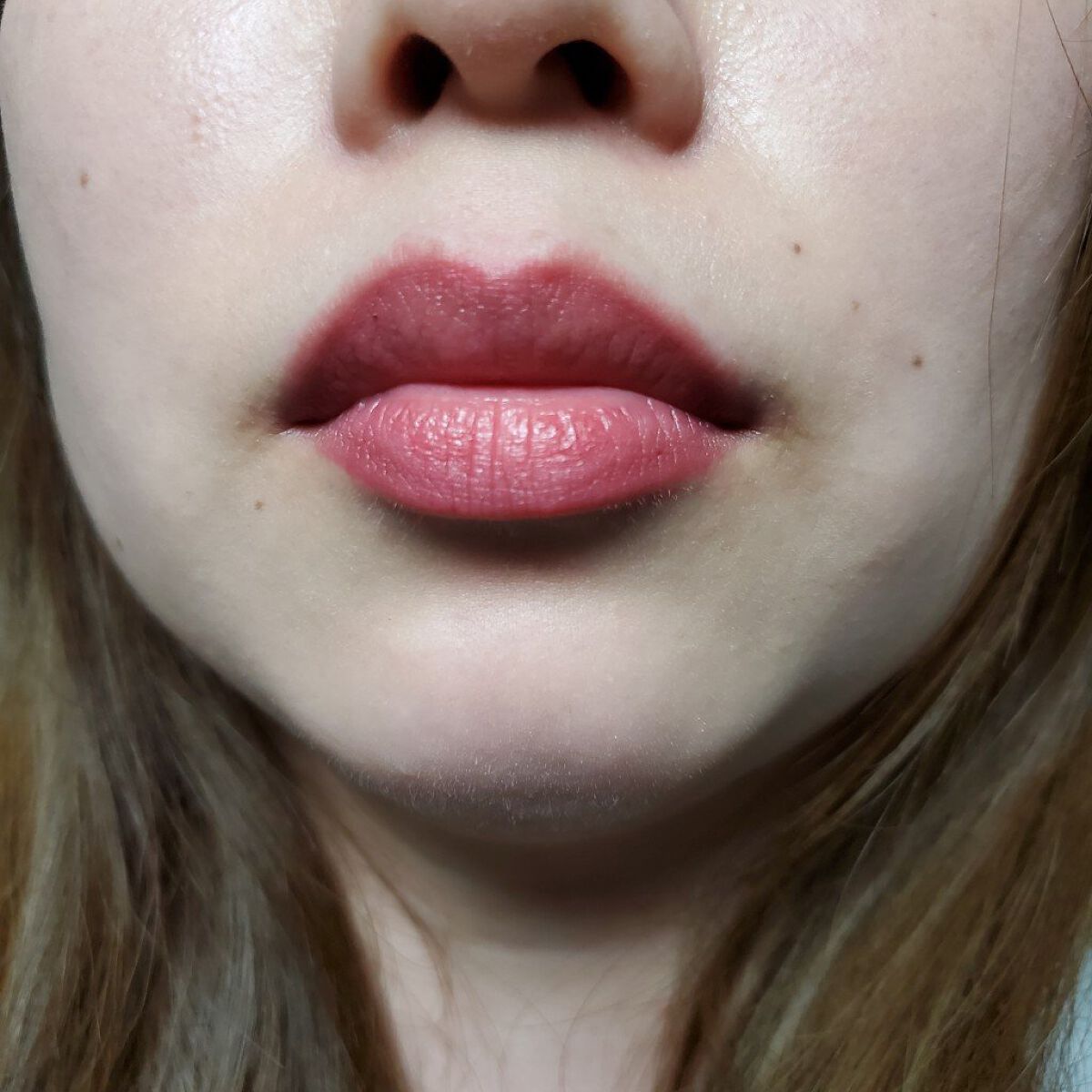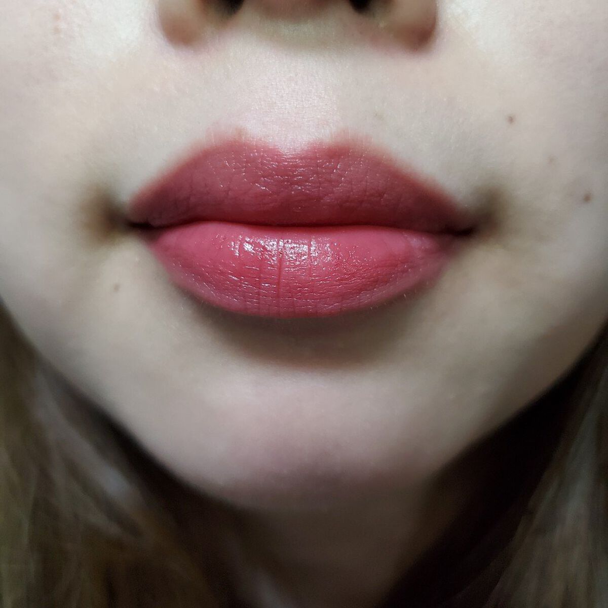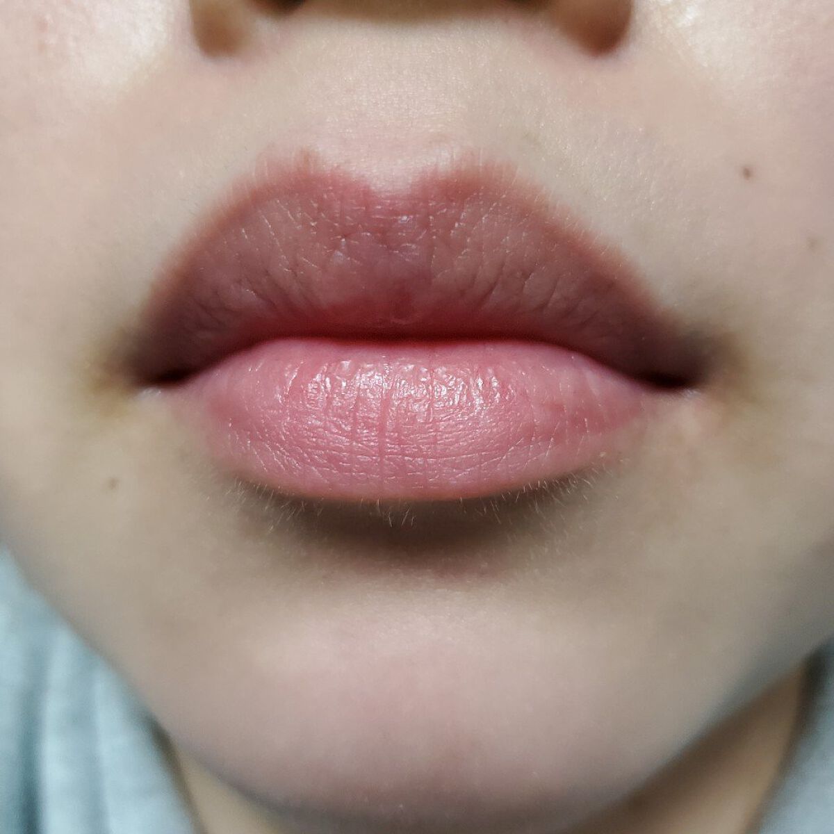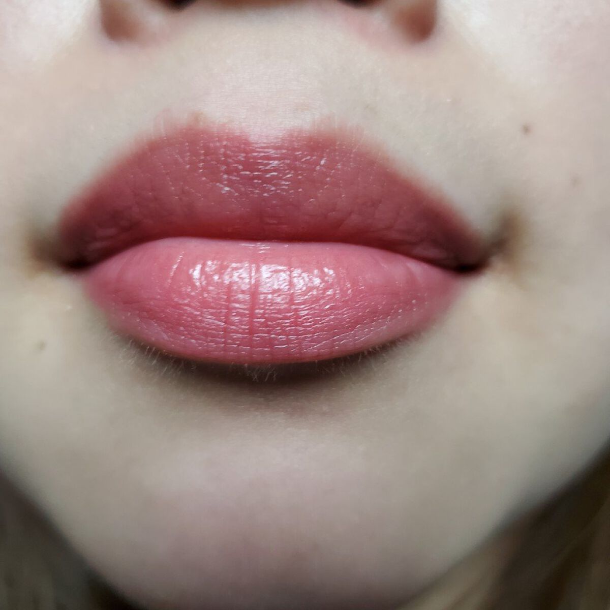 唇の温度で溶け出してスルスルと塗れます。唇に付いたときの粘度は高めで、ひと昔前のチューブタイプのグロスくらいの硬さ。 どちらも使いやす色味でツヤ唇に。粘度があるからかストローとかで飲み物を飲むくらいならすぐにはツヤは落ちない。 注意としては発色させてようと塗りすぎると唇閉じてから開いたときに、ねちゃあって糸引くから気を付けて😟