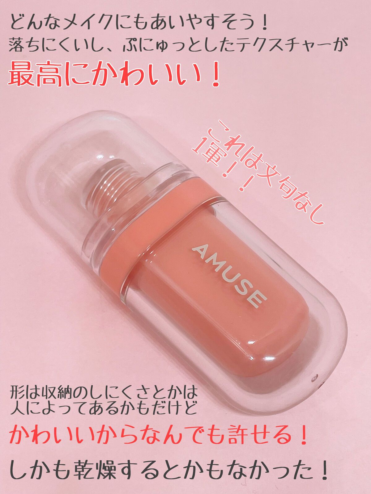 - 濃密なぷにゅっとジェリーが もっちり密着される 長時間持続のジェルフィットティント ☑ぷにゅっとジェリーがもっちり密着される長時間持続&新概念ジェルフィットテクスチャー* ☑8Shadesの透き通るぷにゅっとジェリー発色 ☑3重ツヤシステムで満たせれたぷにゅっとしたジェリーツヤ ☑ジェリーツヤ膜で保湿感ロック ☑手軽いサイズのNEW透明ティント&ぷにゅぷにゅジェリーデザイン ☑ヴィーガン処方 *)AMUSE内において