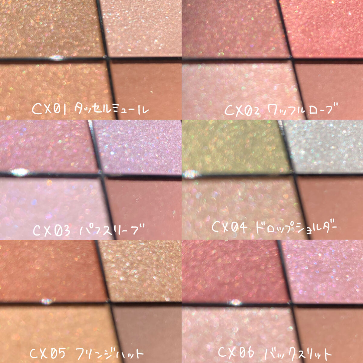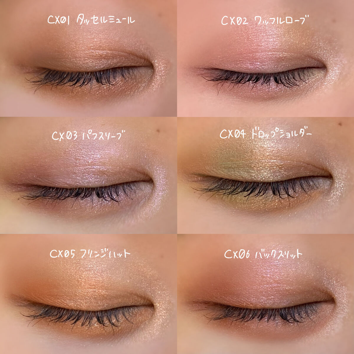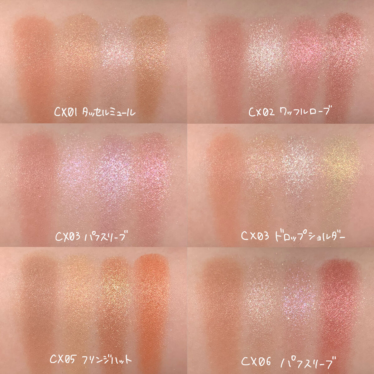 - <CS01-CS05共通> トリエチルヘキサノイン、 リンゴ酸ジイソステアリル、 メタクリル酸メチルクロスポリマー、 イソステアリン酸水添ヒマシ油、 ラウリン酸亜鉛、 スクワラン、 トコフェロール、 メチルパラベン、 (+/-) グンジョウ、 コンジョウ、 タルク、 ホウケイ酸(Ca/Al)、 マイカ、 金、 銀、 酸化チタン、 酸化鉄、 水酸化Al、 赤202、 赤226 <CS07> トリエチルヘキサノイン、 リンゴ酸ジイソステアリル、 メタクリル酸メチルクロスポリマー、 イソステアリン酸水添ヒマシ油、 ラウリン酸亜鉛、 スクワラン、 トコフェロール、 メチルパラベン、 グンジョウ、 タルク、 ホウケイ酸(Ca/Al)、 マイカ、 金、 銀、 酸化チタン、 酸化鉄、 赤202、 赤226 <CS09> トリエチルヘキサノイン、リンゴ酸ジイソステアリル、メタクリル酸メチルクロスポリマー、イソステアリン酸水添ヒマシ油、ラウリン酸亜鉛、スクワラン、トコフェロール、メチルパラベン、(+/-)グンジョウ、コンジョウ、タルク、ホウケイ酸(Ca/Al)、マイカ、金、銀、酸化チタン、酸化鉄、赤202、赤226 <CS10> トリエチルヘキサノイン、リンゴ酸ジイソステアリル、メタクリル酸メチルクロスポリマー、イソステアリン酸水添ヒマシ油、ラウリン酸亜鉛、スクワラン、トコフェロール、メチルパラベン、(+/-)グンジョウ、コンジョウ、タルク、ホウケイ酸(Ca/Al)、マイカ、金、銀、酸化チタン、酸化鉄、赤202、赤226 <CS11> トリエチルヘキサノイン、リンゴ酸ジイソステアリル、メタクリル酸メチルクロスポリマー、イソステアリン酸水添ヒマシ油、ラウリン酸亜鉛、スクワラン、トコフェロール、メチルパラベン、グンジョウ、シリカ、タルク、ホウケイ酸(Ca/Al)、マイカ、金、銀、酸化スズ、酸化チタン、酸化鉄、赤226 <CS14> トリエチルヘキサノイン、 リンゴ酸ジイソステアリル、 メタクリル酸メチルクロスポリマー、 イソステアリン酸水添ヒマシ油、 ラウリン酸亜鉛、 スクワラン、 トコフェロール、 メチルパラベン、 グンジョウ、 シリカ、 タルク、 ホウケイ酸(Ca/Al)、 マイカ、 金、 銀、 酸化スズ、 酸化チタン、 酸化鉄、 赤202、 赤226 <CS16> トリエチルヘキサノイン、リンゴ酸ジイソステアリル、メタクリル酸メチルクロスポリマー、イソステアリン酸水添ヒマシ油、ラウリン酸亜鉛、スクワラン、トコフェロール、メチルパラベン、タルク、ホウケイ酸(Ca/Al)、マイカ、金、銀、酸化チタン、酸化鉄、赤202、赤226 <CX01-CX06共通> トリエチルヘキサノイン、リンゴ酸ジイソステアリル、イソステアリン酸水添ヒマシ油、ラウリン酸亜鉛、ポリグリセリル-3ポリジメチルシロキシエチルジメチコン、スクワラン、トコフェロール、酢酸セルロース、メチルパラベン、(+/-)グンジョウ、シリカ、タルク、ホウケイ酸(Ca/Al)、マイカ、金、銀、酸化スズ、酸化チタン、酸化鉄、水酸化Al、赤202、赤226 <CX07> トリエチルヘキサノイン、リンゴ酸ジイソステアリル、イソステアリン酸水添ヒマシ油、ポリグリセリル-3ポリジメチルシロキシエチルジメチコン、ラウリン酸亜鉛、スクワラン、トコフェロール、酢酸セルロース、メチルパラベン、グンジョウ、タルク、ホウケイ酸(Ca/Al)、マイカ、金、銀、酸化チタン、酸化鉄、水酸化Al、赤202、赤226 <CX08> トリエチルヘキサノイン、リンゴ酸ジイソステアリル、イソステアリン酸水添ヒマシ油、ラウリン酸亜鉛、ポリグリセリル-3ポリジメチルシロキシエチルジメチコン、スクワラン、トコフェロール、酢酸セルロース、メチルパラベン、グンジョウ、シリカ、タルク、ホウケイ酸(Ca/Al)、マイカ、金、銀、酸化スズ、酸化チタン、酸化鉄、水酸化Al、赤226