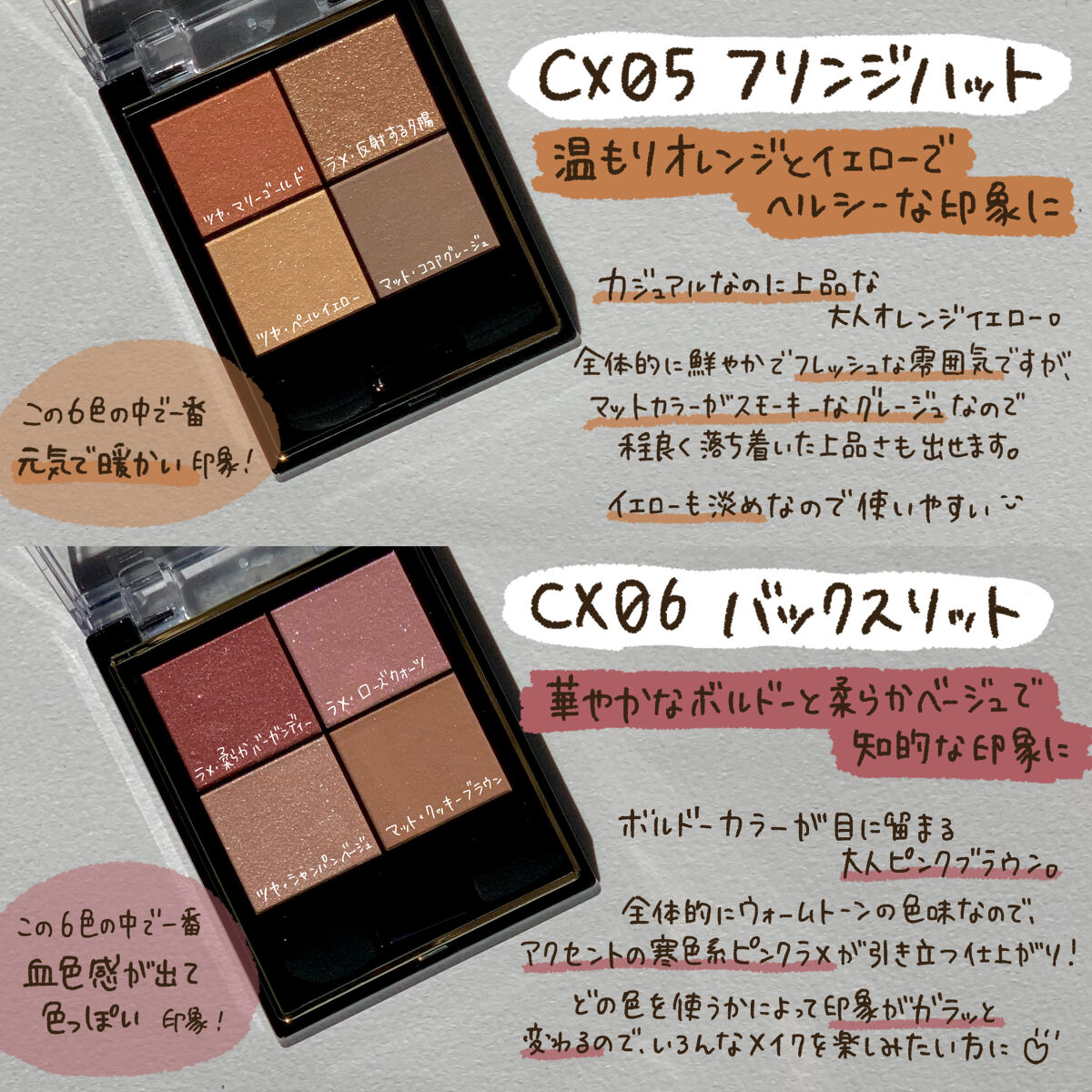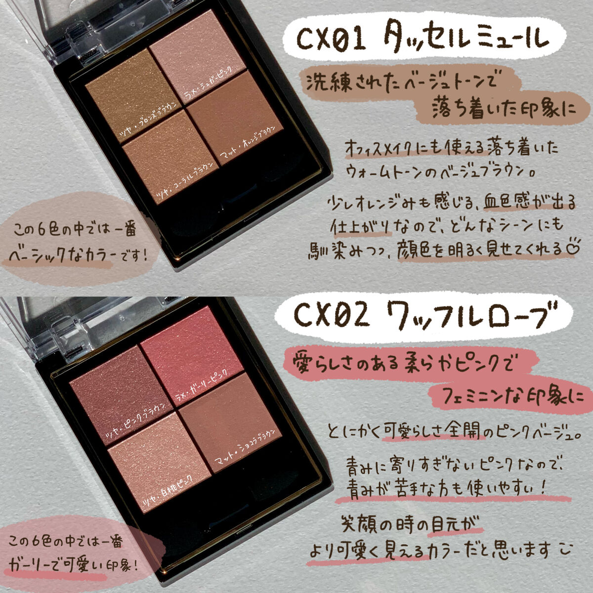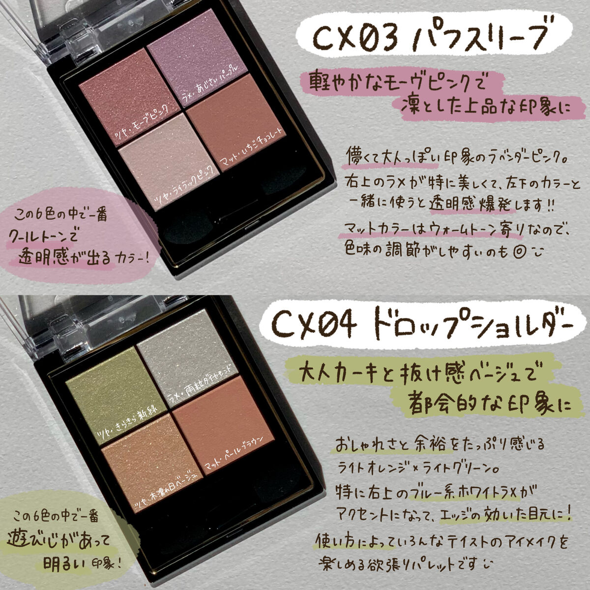 | 3つの異なる質感からなる4色パレットで、使い方によって雰囲気も質感も変わっていきます✨ | 詳細を見る |