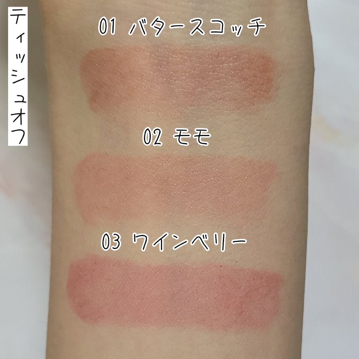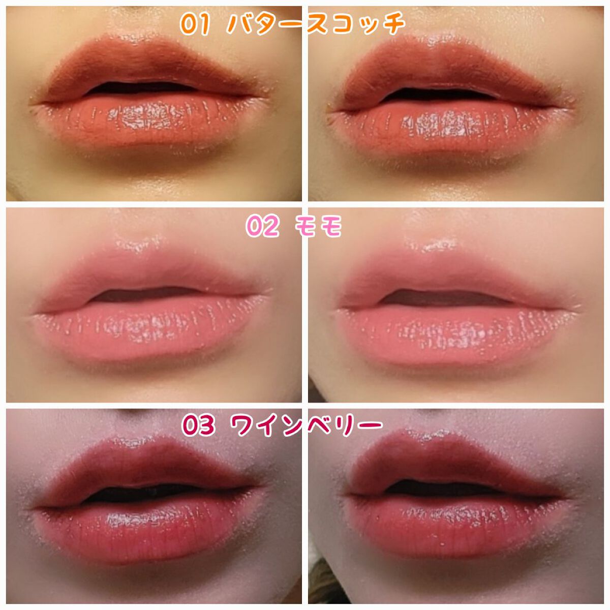 - <01 バタースコッチ> 水添ポリイソブテン、トリエチルヘキサノイン、ビスジグリセリルポリアシルアジペート-2、ヒドロキシステアリン酸エチルヘキシル、ワセリン、リンゴ酸ジイソステアリル、マイクロクリスタリンワックス、合成ワックス、シリカ、セスキイソステアリン酸ソルビタン、メントキシプロパンジオール、キャンデリラロウ、バニリルブチル、トコフェロール、クエン酸、クエン酸Na、ヒアルロン酸Na、アルガニアスピノサ核油、ハチミツ、シア脂、水、BG、加水分解コラーゲン、酸化鉄、酸化チタン、黄4、黄5、赤202、橙201、テトライソステアリン酸ポリグリセリル-2、青1、水酸化Al、赤223 <02 モモ> 水添ポリイソブテン、トリエチルヘキサノイン、ビスジグリセリルポリアシルアジペート-2、ヒドロキシステアリン酸エチルヘキシル、ワセリン、リンゴ酸ジイソステアリル、マイクロクリスタリンワックス、合成ワックス、シリカ、セスキイソステアリン酸ソルビタン、メントキシプロパンジオール、キャンデリラロウ、バニリルブチル、トコフェロール、クエン酸、クエン酸Na、ヒアルロン酸Na、アルガニアスピノサ核油、ハチミツ、シア脂、水、BG、加水分解コラーゲン、酸化チタン、黄4、黄5、赤202、酸化鉄、橙201、水酸化Al、テトライソステアリン酸ポリグリセリル-2 <03 ワインベリー> 水添ポリイソブテン、トリエチルヘキサノイン、ビスジグリセリルポリアシルアジペート-2、ヒドロキシステアリン酸エチルヘキシル、ワセリン、リンゴ酸ジイソステアリル、マイクロクリスタリンワックス、合成ワックス、シリカ、セスキイソステアリン酸ソルビタン、メントキシプロパンジオール、キャンデリラロウ、バニリルブチル、トコフェロール、クエン酸、クエン酸Na、ヒアルロン酸Na、アルガニアスピノサ核油、ハチミツ、シア脂、水、BG、加水分解コラーゲン、黄4、赤202、酸化チタン、酸化鉄、橙201、黄5、テトライソステアリン酸ポリグリセリル-2、赤223、水酸化Al、青1 <05 フィグピューレ> 水添ポリイソブテン、トリエチルヘキサノイン、ビスジグリセリルポリアシルアジペート-2、ヒドロキシステアリン酸エチルヘキシル、ワセリン、リンゴ酸ジイソステアリル、マイクロクリスタリンワックス、合成ワックス、シリカ、セスキイソステアリン酸ソルビタン、メントキシプロパンジオール、キャンデリラロウ、バニリルブチル、トコフェロール、クエン酸、クエン酸Na、ヒアルロン酸Na、アルガニアスピノサ核油、ハチミツ、シア脂、水、BG、加水分解コラーゲン、酸化チタン、黄4、赤202、黄5、酸化鉄、橙201、青1、水酸化Al、テトライソステアリン酸ポリグリセリル-2、赤223 <06 ラズベリーケーキ> 水添ポリイソブテン、トリエチルヘキサノイン、ビスジグリセリルポリアシルアジペート-2、ヒドロキシステアリン酸エチルヘキシル、リンゴ酸ジイソステアリル、ワセリン、マイクロクリスタリンワックス、合成ワックス、シリカ、セスキイソステアリン酸ソルビタン、メントキシプロパンジオール、キャンデリラロウ、バニリルブチル、トコフェロール、クエン酸、クエン酸Na、ヒアルロン酸Na、アルガニアスピノサ核油、ハチミツ、シア脂、水、BG、加水分解コラーゲン、酸化チタン、酸化鉄、赤202、橙201、水酸化Al、テトライソステアリン酸ポリグリセリル-2、青1、赤223、黄5 <07 フルーツオレ> 水添ポリイソブテン、トリエチルヘキサノイン、ビスジグリセリルポリアシルアジペート-2、ヒドロキシステアリン酸エチルヘキシル、ワセリン、リンゴ酸ジイソステアリル、マイクロクリスタリンワックス、合成ワックス、シリカ、セスキイソステアリン酸ソルビタン、メントキシプロパンジオール、キャンデリラロウ、バニリルブチル、トコフェロール、クエン酸、クエン酸Na、ヒアルロン酸Na、アルガニアスピノサ核油、ハチミツ、シア脂、水、BG、加水分解コラーゲン、酸化チタン、酸化鉄、黄4、水酸化Al、赤202、橙201、黄5、青1、テトライソステアリン酸ポリグリセリル-2 <04 チョコミルク> 水添ポリイソブテン、トリエチルヘキサノイン、ビスジグリセリルポリアシルアジペート-2、ヒドロキシステアリン酸エチルヘキシル、リンゴ酸ジイソステアリル、ワセリン、マイクロクリスタリンワックス、合成ワックス、シリカ、セスキイソステアリン酸ソルビタン、メントキシプロパンジオール、キャンデリラロウ、バニリルブチル、トコフェロール、クエン酸、クエン酸Na、ヒアルロン酸Na、アルガニアスピノサ核油、ハチミツ、シア脂、水、BG、加水分解コラーゲン、酸化鉄、青1、酸化チタン、橙201、赤202、テトライソステアリン酸ポリグリセリル-2、黄4、水酸化Al