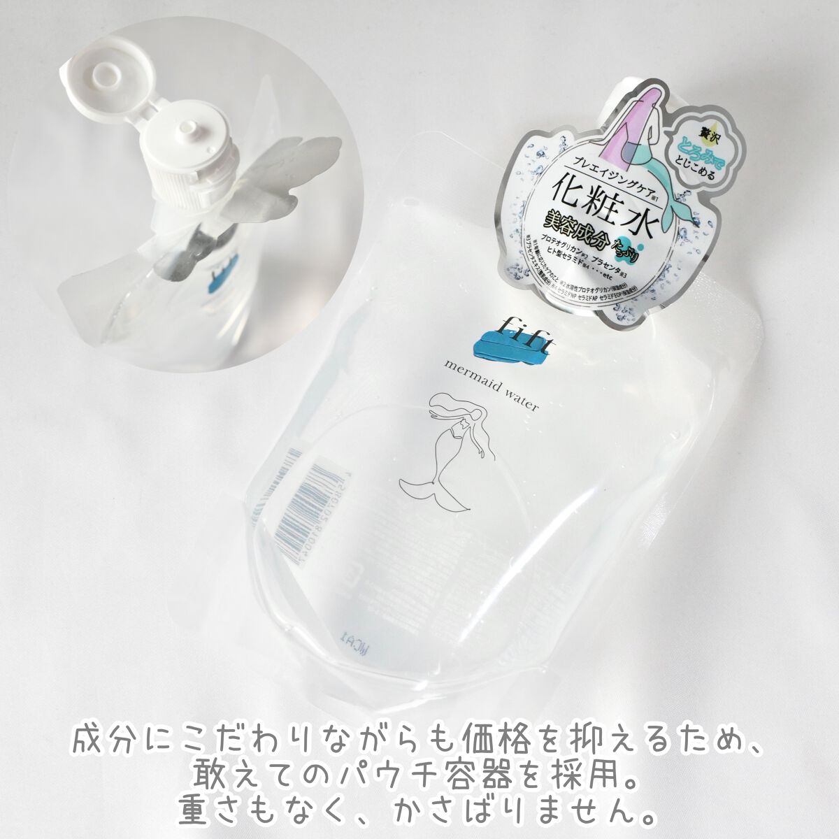 - 人魚のように、ずっとずっと美しく。そんな想いを込めてつくられました。 25歳から使ってもらいたいプレエイジングケア*化粧水。 本気で成分にこだわった化粧水だからこそ、それらを肌から逃がさない工夫をしました。美容保湿成分をたっぷり配合。そして、美容液のようなとろっとした贅沢な質感で肌に膜をはり蓋をします。最初は慣れないかもしれませんが、使い終わるころには変化を楽しんでいただけると思います。 伸びのよいテクスチャーで使用量も少量のため、経済的に使い続けていただけます。 *年齢に応じたお手入れ