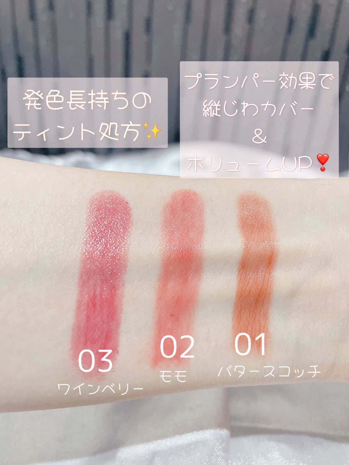 - とろけて潤うむっちりぷるぷる唇に! その名の通り、むっちりとしたボリューム感とぷるぷるツヤツヤな魅力的な唇に仕上がるティントリップです。 Point1【むっちりぷるぷる唇】 ・プランパー効果で縦じわカバー&ボリューム感のあるむっちり唇に ※メイクアップ効果による ・スーッとした清涼感のある使い心地 Point2【ちゅるんとしたツヤティント】 ・シロップのようなちゅるんとしたツヤが持続 ・塗った時の色が長持ちするティント処方 唇の上でとろけるメルティングオイルを配合しています。 するすると抵抗感がなく、なめらかな塗り心地で、重ね塗りをしてもムラなくきれいに仕上がります。 6種の美容保湿成分配合。リップクリームいらずで潤いが持続します。 ≪ワセリン・ヒアルロン酸・コラーゲン・アルガンオイル・ハチミツ・シアバター≫ 無香料 ・清涼感のある使い心地です。 ・大変やわらかい中身ですので、1㎜程度くり出して、ゆっくりやさしく塗布してください。 ・一度繰り出した中身は戻りませんので、出し過ぎにご注意ください。