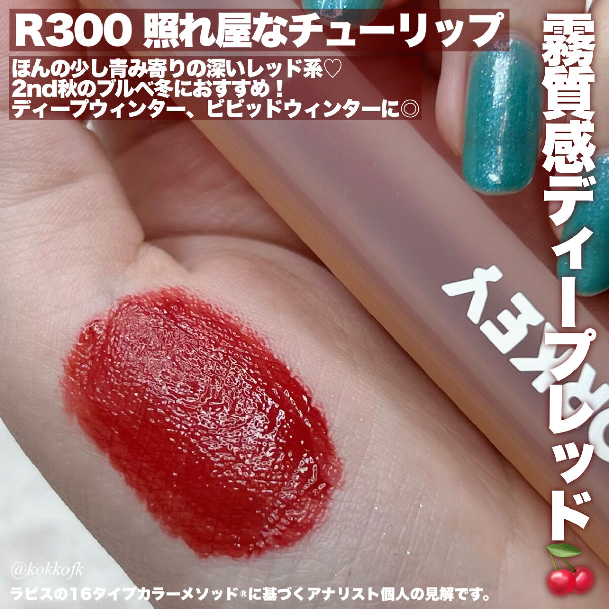 薄く唇に密着する新作マットティント。 マットなのにかなりしっとりとしていて 乾燥を感じなくてびっくりでした! 一気にこなれ感が出るトレンドカラーです♡ やや青みの華やかローズレッド 公式画像より鮮やかめに感じました。 やや黄みの強くて深いオレンジレッド ストロングオータムに超激推しです! やや黄みの非常に深く濃いダークブラウン ディープオータムに激推しです! かわいい雰囲気になれるピンクリップです♡ やや青みの柔らかいくすみピンクベージュ ミューテッドサマーにおすすめです! 青みの落ち着いたローズピンク やや青みのとても鮮やかなビビッドレッド ビビッドウィンターに特におすすめ! 既存マットティントよりもさらに ふわふわなマット感が魅力のリップで、 軽くティッシュオフしてもほとんど落ちない◎ マスクにも激推しのティントなので、 ぜひ皆さんもチェックしてみてね❤︎