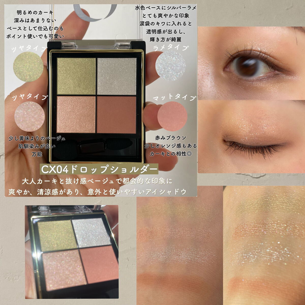 - 1.重ねてもくすまないクリアな発色。ナチュラルに溶け合う絶妙4カラー。 ツヤタイプ(左上・左下カラー):アイホール全体にぼかしたり、目尻へのポイント使いも。 ラメタイプ(右上カラー):アイホール中心や下まぶたにきらめきのアクセント。 マットタイプ(右下カラー):単色で陰影を付けたり、ツヤタイプと重ねてニュアンスをプラス。 2.うっとりするほどリッチな質感で粉飛びしないのに、軽いタッチで伸びて重ねやすいテクスチャー。 3.スクワラン(保湿)配合で目元の乾燥を防ぎます。 [PERFORMANCE] 色と質感の重ね着を楽しむ、ファッション感覚アイシャドウパレット [DESIGN] ・まぶたにひっかからない、なめらかな上質チップ ・薄型コンパクトだからポーチの中でかさばらない [QUALITY] 1.重ねてもくすまないクリアな発色 ナチュラルに溶け合う絶妙4カラー 2.パールの重ね技でまぶたに極上のツヤ感 微細多色 カラーパール 銀コーティング ガラスパール* excel GOLD-MIX処方(金パール配合)* (*右上のシャイニーカラーのみ) 3.うっとりするほどリッチな質感で粉飛び知らず!なのに、軽いタッチで伸びて重ねやすい 4.スクワラン(保湿)配合で目元の乾燥を防ぐ