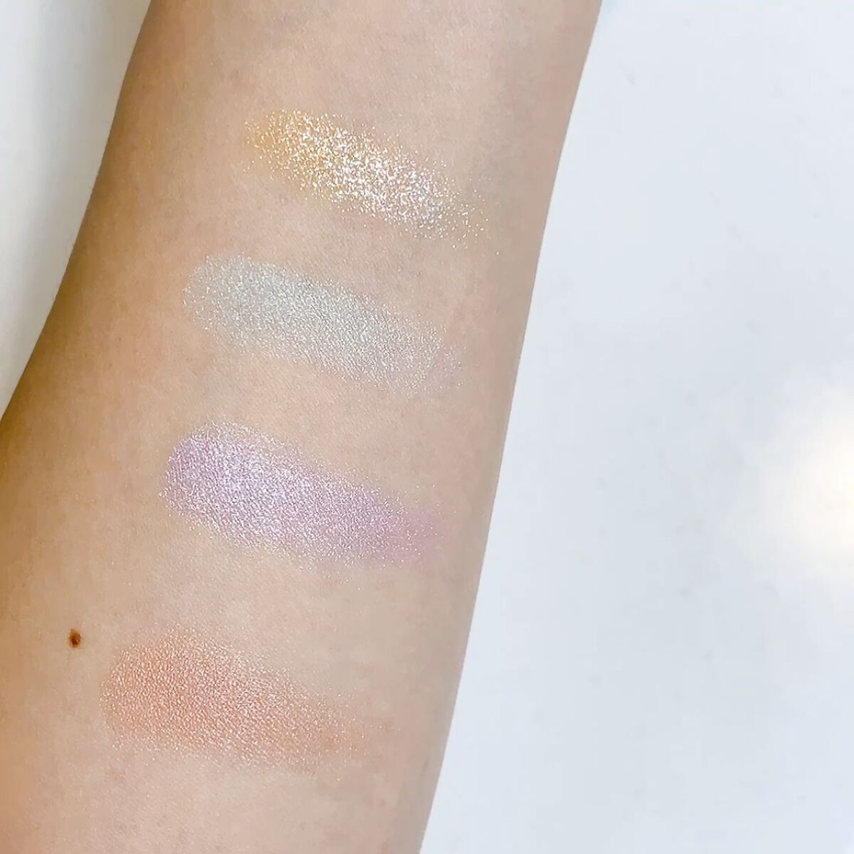 かなりくすみ感強いパレットは ふんわり柔らかい発色で淡い色づき ラメカラーの煌めきの高さ💎꙳⋆ グレイッシュでぱっと見かなり暗めの配色に見えるんだけど ラメがかなり華やかだからこの暗さにこのラメが際立つ✨ くすみ感の強いベージュピンクがマットカラー 発色が良くキラッキラのシャインロゼカラー マーブル模様で見た目も可愛いホワイトパール 締め色はグレーがかった深みのブラウン スウォッチしてみるとシャインロゼカラーは かなりしっかり発色するけど他はふんわり柔らかい発色 このラメが可愛すぎて買っちゃったけど ラメのおかげで沈んで見えない ピンクだけど大人っぽくて 落ち着いた雰囲気になるのも可愛い❤️ いつもの可愛いピンクメイクから ちょっと大人にグレードアップ💓 大人が使いたいピンクパレットだね🎨*°♡
