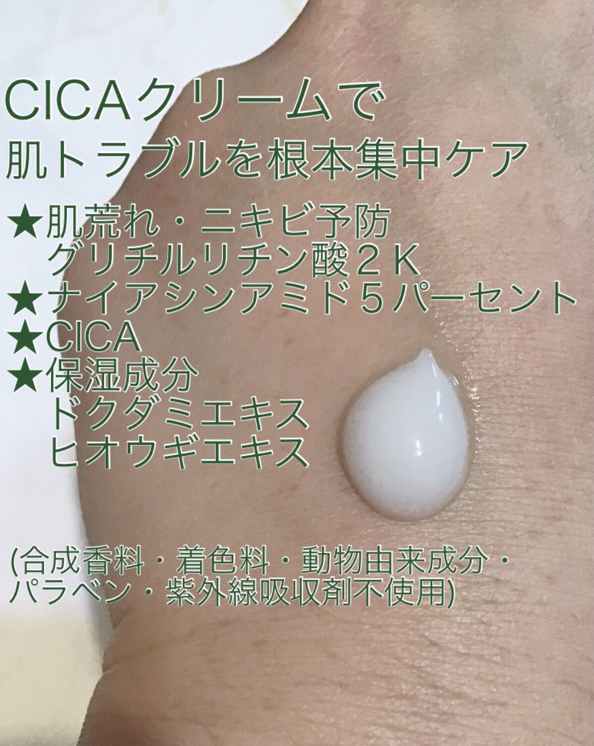 にきび予防、肌あれ予防、皮膚を健やかに保ち、うるおいを与える 合成香料・着色料・動物由来成分・パラベン・紫外線吸収剤フリー の無添加処方 水分の多いクリームで すーっと伸びてコッテリしてないので使いやすい👏