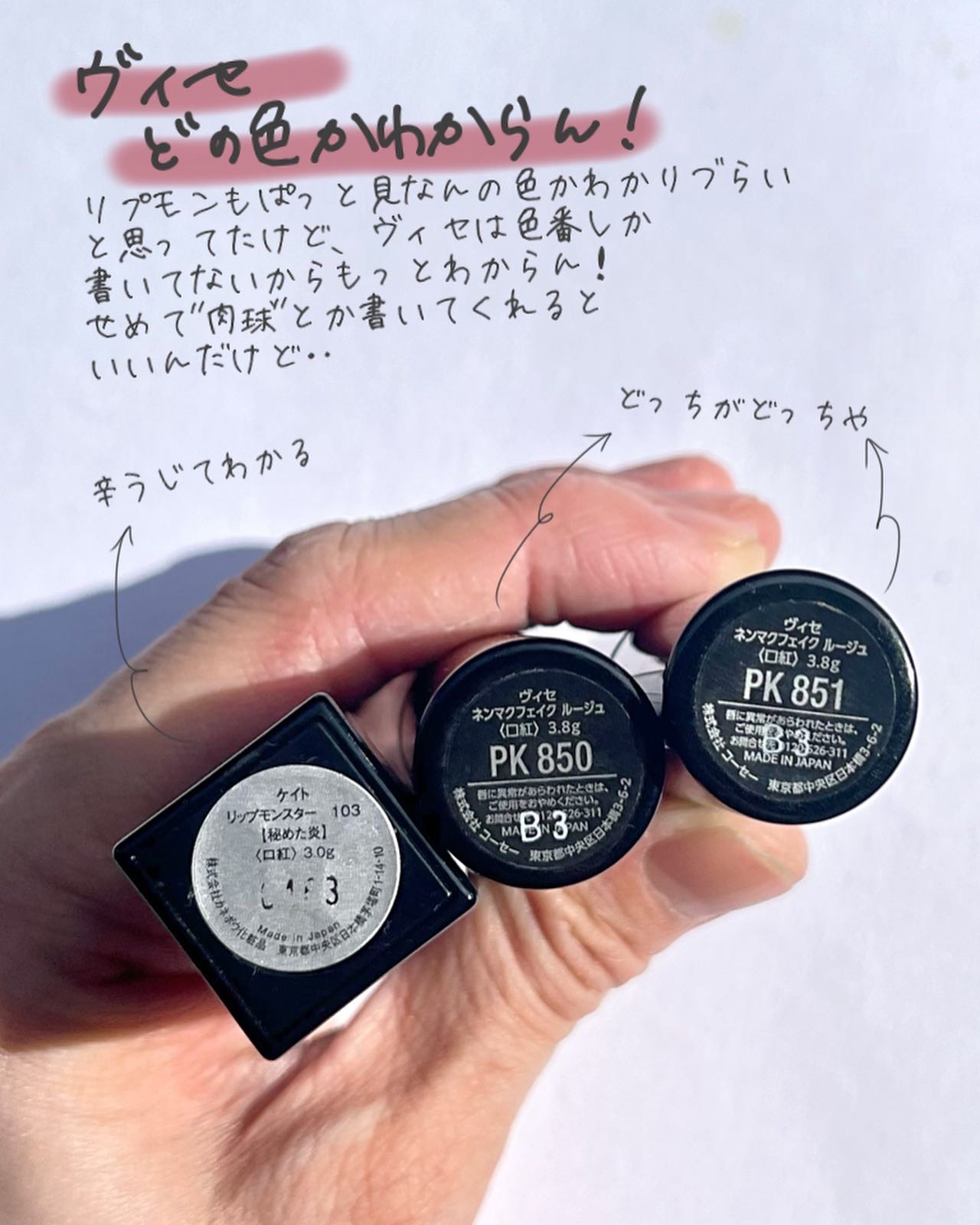 発色はけっこうよくて一度塗りでもしっかり色づく。 色持ちはティントじゃないからそこまでよくはないかな。 ツヤ感、透明感ありでどんなメイクの時にも使いやすい。 唇の血色悪い人はこの透明感で思ってたより発色しないかもしれない。 唇の血色いい人はヴィセの方が合ってそう。