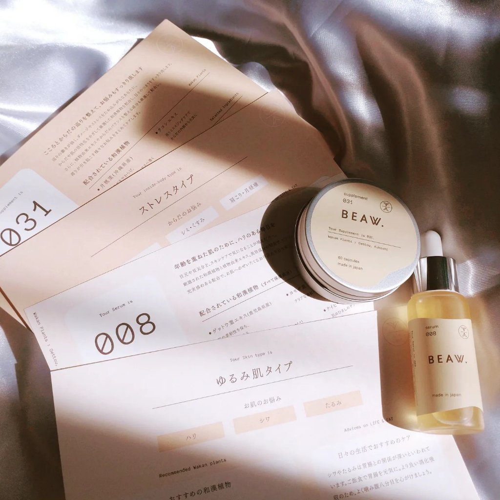 - ・BEAW.のパーソナライズケアは始めにパーソナライズ診断を行い、20種類の和漢と、自然由来の保湿成分の組み合わせから、一人ひとりに合わせた製品をお届けします。 ・現在の自分の悩みにぴったりのパーソナルケアキット、和漢植物由来成分を配合した2剤式のセラムとサプリメントのセットでお届けします。からだの内と外から同時に理想の美しさをめざせるデュアルケアで、あなたの美容をサポートします。 ・美容液は、肌荒れ予防、乾燥、毛穴、テカリ、くすみ*、年齢肌、ツヤ肌、などその人それぞれの悩みに対して適した処方で国産和漢植物成分と、植物エキス、ビタミンやセラミド、プラセンタ、ナイアシンアミド、などを配合した保湿成分を分析結果に合わせて配合。*乾燥による ・サプリメントは体の内側からキレイをサポートする国産和漢植物成分と20種類以上のビタミン、ミネラルをそれぞれに合わせて配合。 -対象商品- BEAW.リッチセラム003、008、015 BEAW.サプリメント:001、007、031 BEAW.フェイスウォッシュ:019、026、045 -内容量- BEAW.リッチセラム:30ml BEAW.サプリメント:60粒 BEAW.フェイスウォッシュ:80g