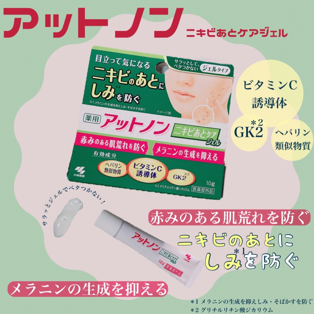 \ニキビのあとケア、コレ使って♡/ニキビのあとは、刺激などの炎症によりメラニンの生成が促されてしみになりやすいの🥲そうなる前にコレがオススメ!♡小林製薬アットノンニキビあとケアジェル(医薬部外品)スキンケアの最後ではなく洗顔後、スキンケア前に...