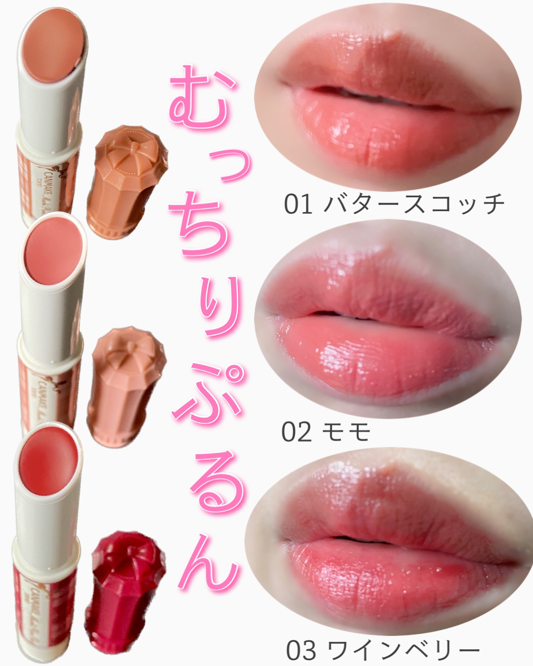 \キャンメイクむちぷる全色パソカ図鑑/📝キャンメイクむちぷるティント¥77001バタースコッチ02モモ03ワインベリー05フィグピューレ06ラズベリーケーキ07フルーツオレ40thxストロベリーボンボン#キャンメイク#プチプラコスメ#ティント...