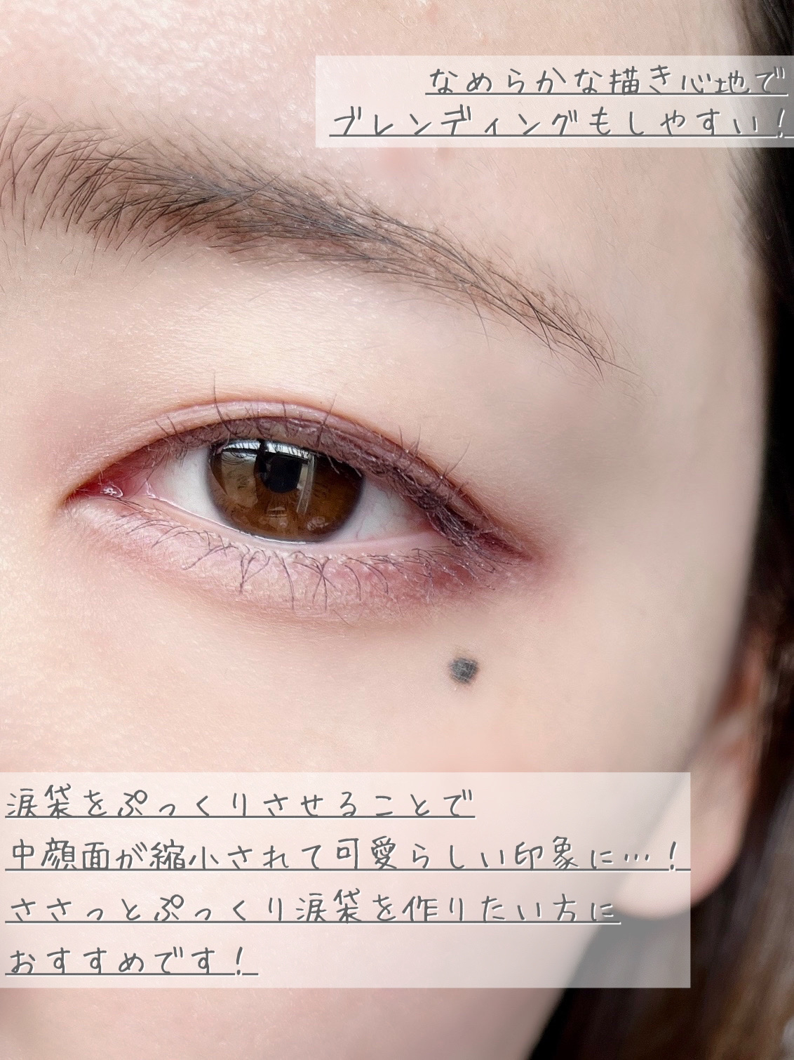 - 1.2色で簡単 涙袋完成 陰影ライナーで涙袋の影をサッと描いて 反対側のカラーシャドウで涙袋全体を埋めるだけで、 生まれつきの涙袋*のように ぷっくり自然な仕上がりに! 2. 粉飛びせずなめらかフィット 1回でスムーズに描ける柔らかい密着テクスチャー ムラなくヨレにくい、簡単にブレンディングできる クリームフォーミュラ 3. 描きやすい細芯タイプ 狭くて細い部位にも繊細なタッチでメイクが完成! 涙袋メイクに特化した #超繊細サイズ *メイクアップ効果による