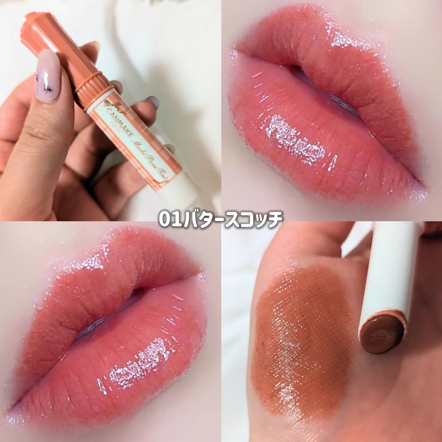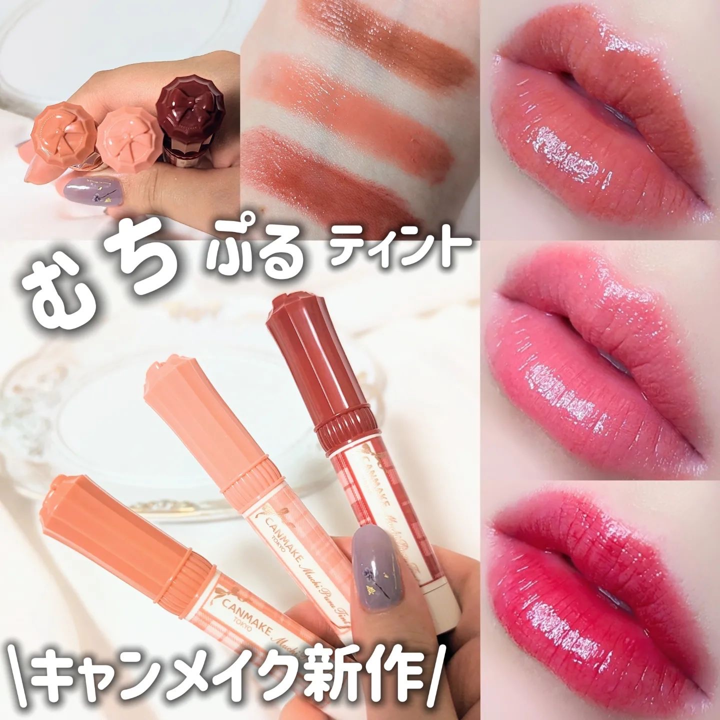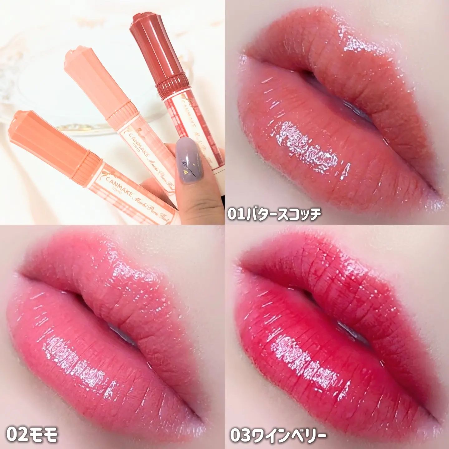 \キャンメイクむちぷる全色パソカ図鑑/📝キャンメイクむちぷるティント¥77001バタースコッチ02モモ03ワインベリー05フィグピューレ06ラズベリーケーキ07フルーツオレ40thxストロベリーボンボン#キャンメイク#プチプラコスメ#ティント...