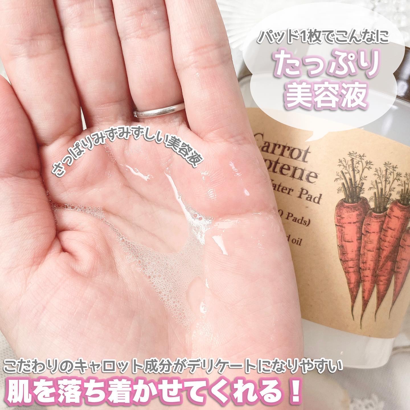 キャロットパットといえば韓国オリヤン1位※パッド🥕 柔らかくて厚みのあるパッドで半分に割いてパックとして使用できる 液をたっぷりと含んでいるのでお肌の内側までしっかり潤してくれるのを実感しました✨️✨️ 30枚も入ったボックスタイプのパックなので惜しみなく使えます💛メイク前に使うとメイクノリがいいので個人的にはメイク前の使用をおすすめ🎀💟