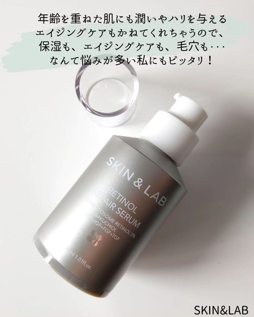 - 刺激を最小限に抑えた使い心地でハリのある肌に導くレチノールセラム ★光と熱に不安定なレチノールを植物性リポソームで安定化させた、SKIN&LABだけのヴィーガンリポソームレチノール*を3%配合。 ★注目の3成分、レチノール*、バクチオール*、ペプチド*配合。 ★年齢を重ねた肌にも潤いやハリを与えるエイジングケアを叶えます。 ★小さいナノリポソームレチノール*で角質層隅々まで浸透し毛穴ケア <成分と効果> ・ヴィーガンリポソームレチノール*:植物性リポソームで安定化させたヴィーガンレチノール*を配合。刺激の少ない使い心地です。 ・バクチオール*:バクチオールは植物由来の成分で肌にハリを与えます。 ・EGF+IGF+FGF+TGF(ペプチド)*:ペプチドは肌本来の力をサポートして、潤いの持続する肌へと導きます。 *整肌成分