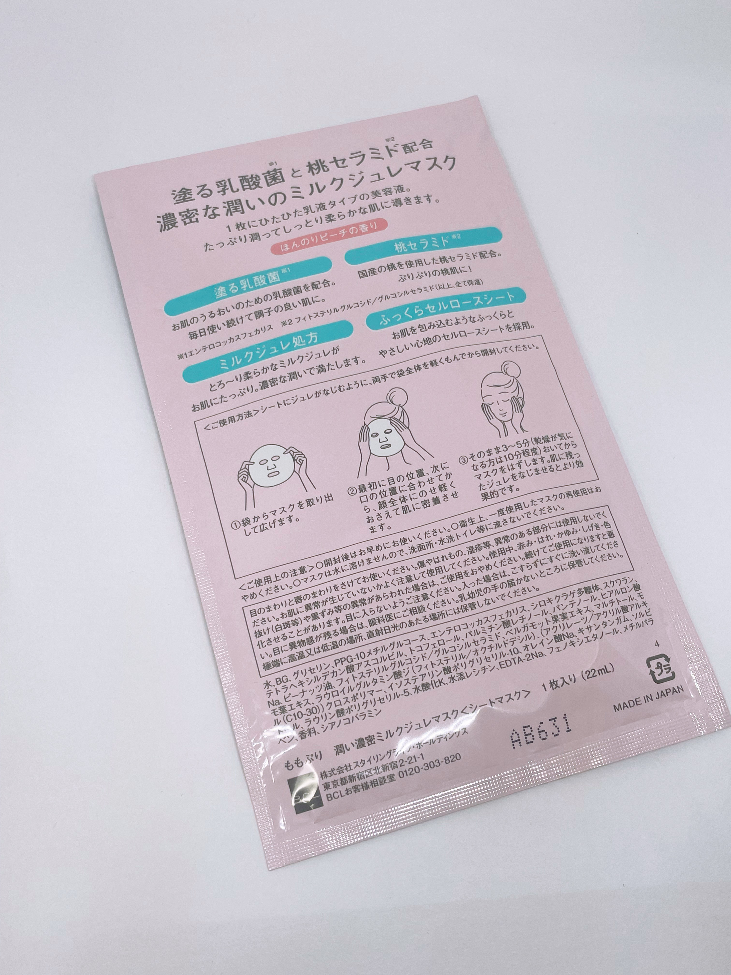 ほんのりピーチの香り 桃セラミドと3種のセラミド ミルキーセラム処方 潤いと肌触り滑らかなしっとり仕上がり ぷるんとした潤い感が有り油分感は感じさせない 個包装で衛生的かつ使いたい時に開封出来る