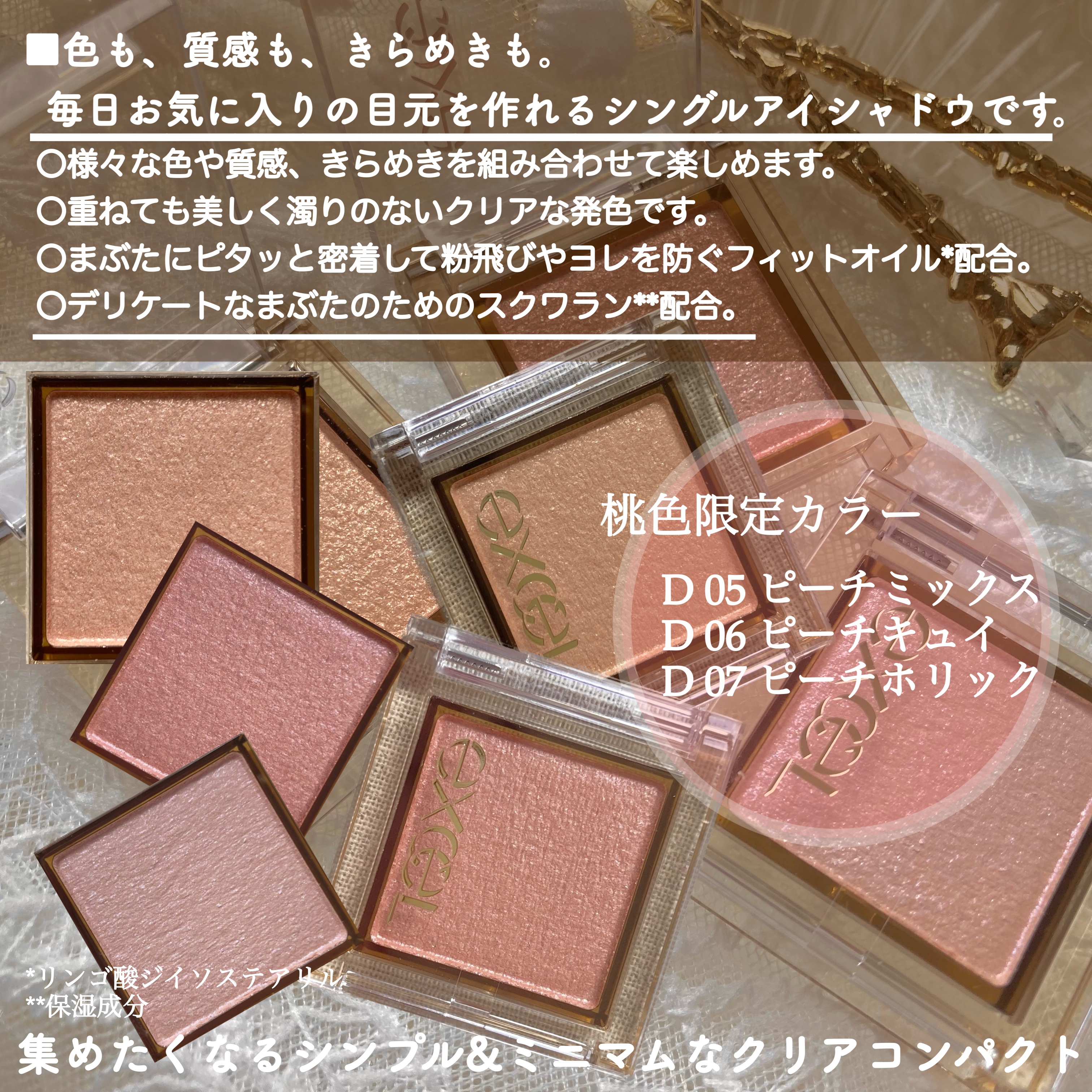 🌷excelエクセルアイプランナー *D06ピーチキュイ[限定色]大粒偏光パール配合の桃カラーシャドウ[限定色]🍑⚪︎美しいクリアな発色 異なる種類や色を重ねても 濁りのないクリアな発色⚪︎密着してヨレない フィットオイル配合で まぶたにピタ...