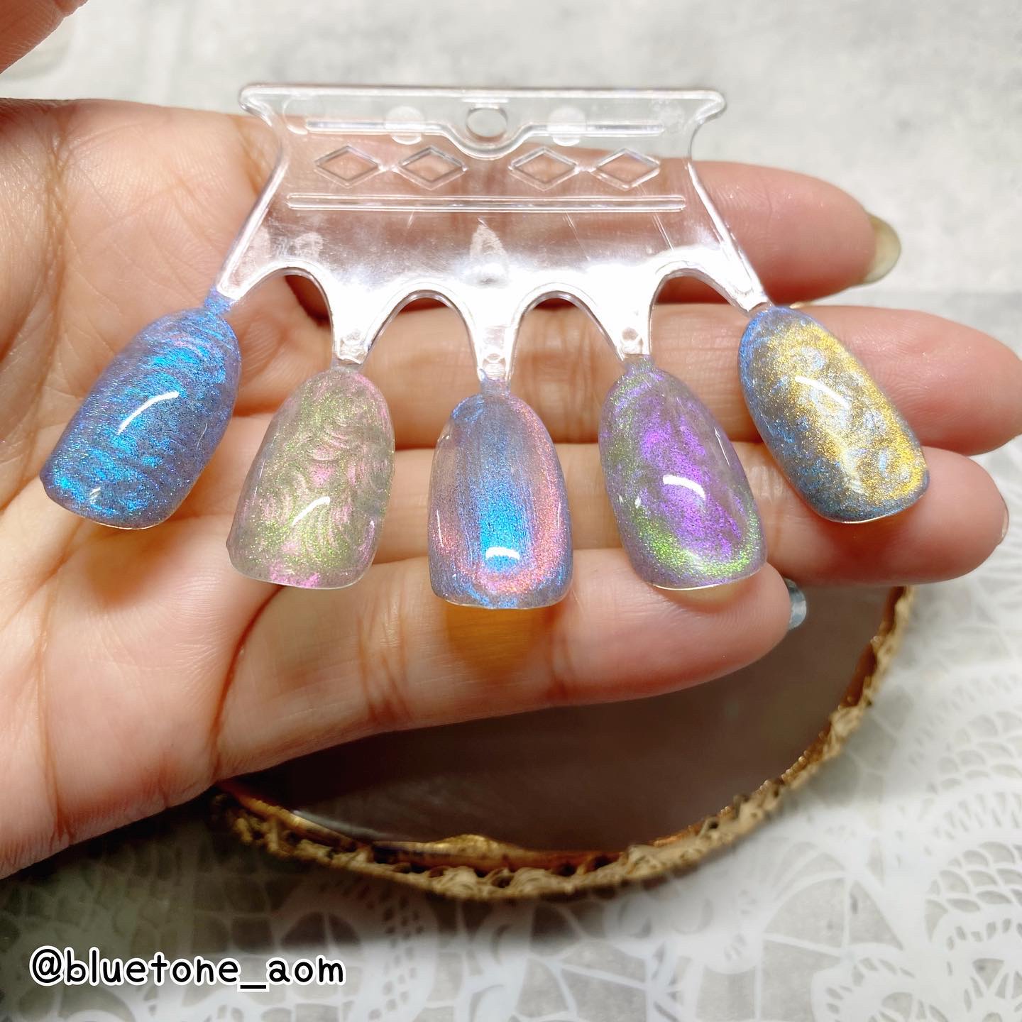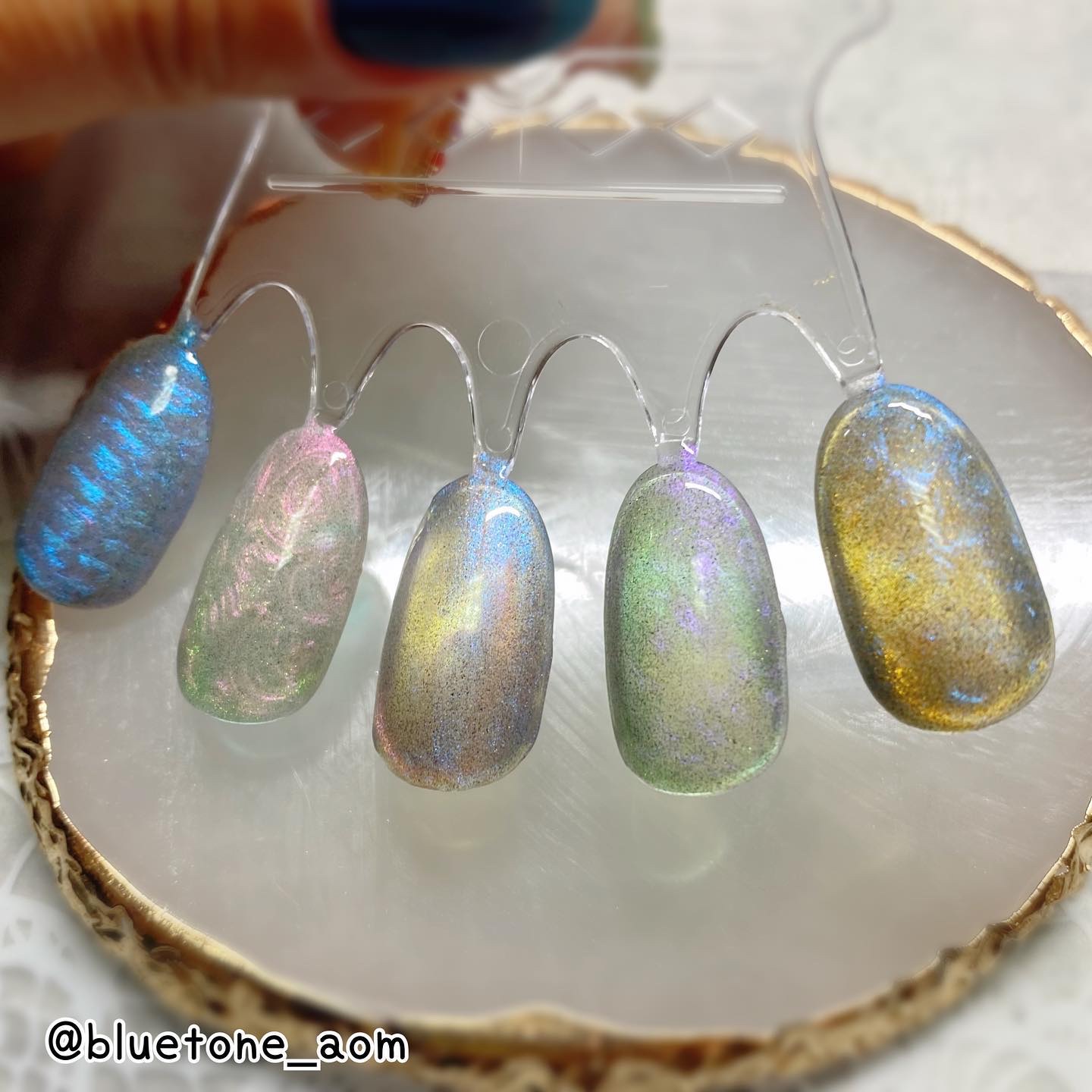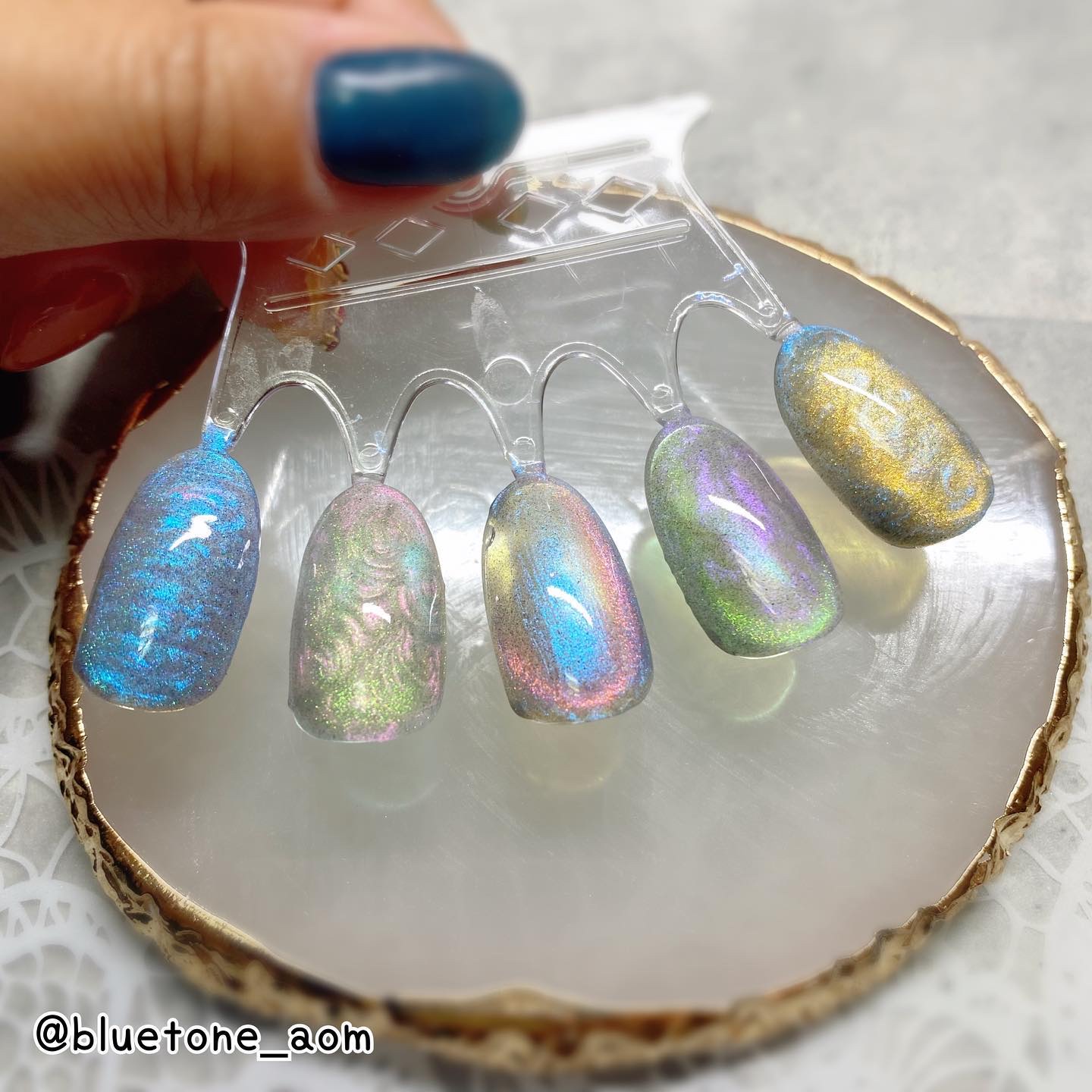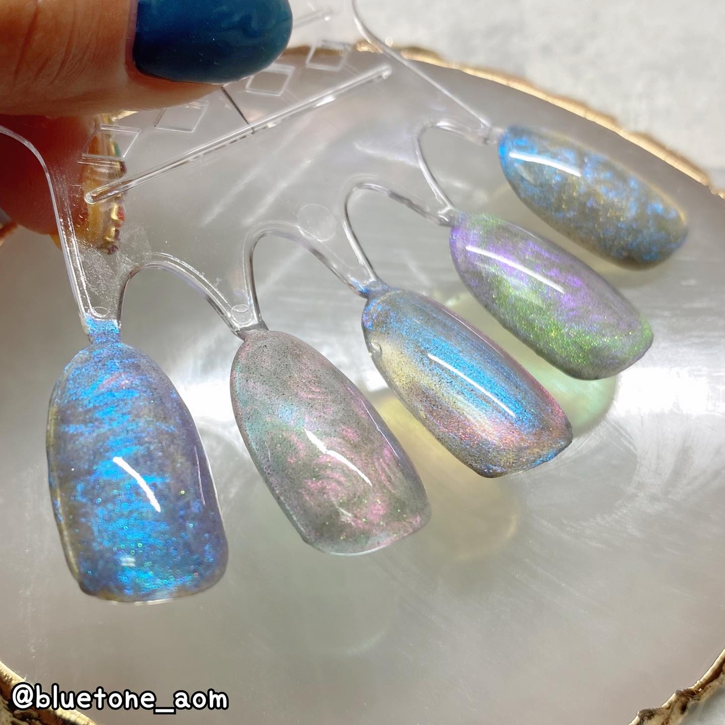 ラメがしっかりしてるし クリアカラーが入ってるから オーロラパウダー無しでも 充分キラキラしました! 反射強めのフィルムなので 実物はもっと うるうるとキラキラが強いです! ビー玉みたい🥺 ネイルシール長持ちさせたいけど ちょっと飽きてきたな〜って時とかに 全然違った印象になるのでオススメです! Seriaのベースジェル 本当にうるうるネイルしやすいので オススメしたい🙆♀️