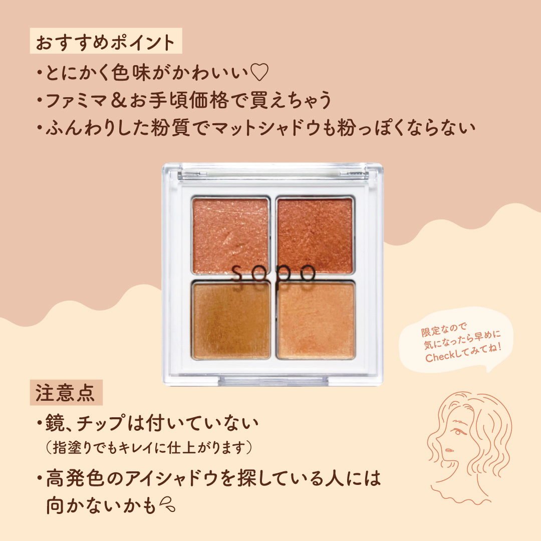 【#SOPO】#sopoアイパレット04#ダズルベージュ自然な陰影を引き出す下段2色のマットな透け感ベージュがポイント。左上には温かく輝くコーラル×ゴールドのラメ、右上には繊細なパールを配置し、様々な質感と色の組み合わせが楽しめるアイパレット...