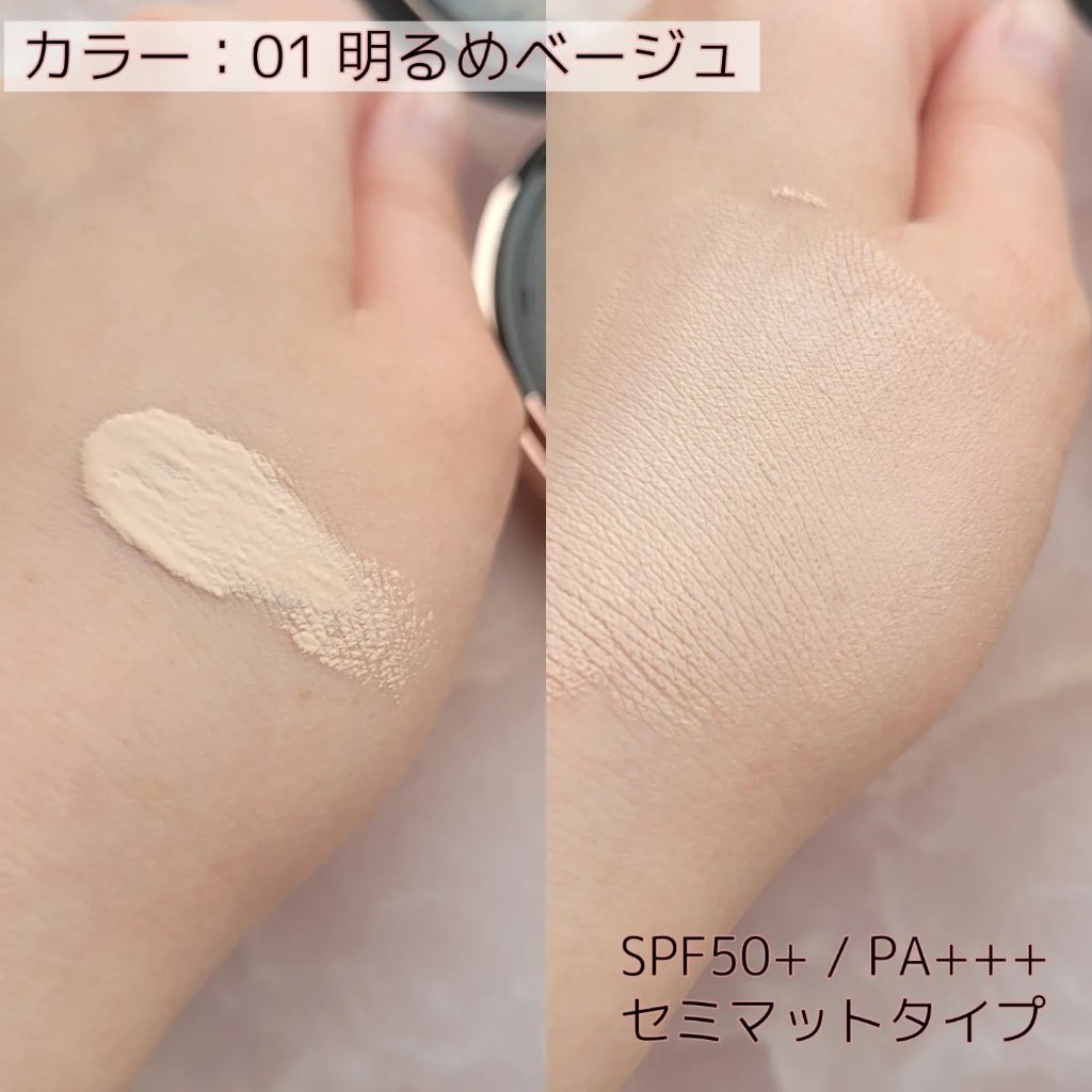 - <01 ライトベージュ> 水、シクロペンタシロキサン、メトキシケイヒ酸エチルヘキシル、DPG、サリチル酸エチルヘキシル、ラウリルPEG-9ポリジメチルシロキシエチルジメチコン、イソドデカン、ポリメチルシルセスキオキサン、エチルヘキサン酸セチル、ジフェニルシロキシフェニルトリメチコン、ナイアシンアミド、トリメチルシロキシケイ酸、トリシロキサン、1,2-ヘキサンジオール、ジメチコン、PEG-10ジメチコン、シリカ、ジステアルジモニウムヘクトライト、硫酸Mg、オクチルドデカノール、ポリグリセリル-3ポリジメチルシロキシエチルジメチコン、(アクリレーツ/アクリル酸ステアリル/メタクリル酸ジメチコン)コポリマー、ステアリン酸、アルミナ、トリエトキシカプリリルシラン、ポリヒドロキシステアリン酸、イソステアリン酸ポリグリセリル-4、ジミリスチン酸Al、アデノシン、エチレンジアミンジコハク酸3Na、ジエチルヘキサン酸ネオペンチルグリコール、トコフェロール、アルガニアスピノサ核油、セラミドNP、グリチルリチン酸2K、PVP、酸化チタン、酸化鉄、マイカ、水酸化Al、トリイソステアリン酸イソプロピルチタン <02 ナチュラルベージュ> 水、シクロペンタシロキサン、メトキシケイヒ酸エチルヘキシル、DPG、サリチル酸エチルヘキシル、ラウリルPEG-9ポリジメチルシロキシエチルジメチコン、イソドデカン、ポリメチルシルセスキオキサン、エチルヘキサン酸セチル、ジフェニルシロキシフェニルトリメチコン、ナイアシンアミド、トリメチルシロキシケイ酸、トリシロキサン、1,2-ヘキサンジオール、ジメチコン、ジステアルジモニウムヘクトライト、PEG-10ジメチコン、シリカ、オクチルドデカノール、硫酸Mg、ポリグリセリル-3ポリジメチルシロキシエチルジメチコン、(アクリレーツ/アクリル酸ステアリル/メタクリル酸ジメチコン)コポリマー、ステアリン酸、アルミナ、トリエトキシカプリリルシラン、イソステアリン酸ポリグリセリル-4、ポリヒドロキシステアリン酸、ジミリスチン酸Al、アデノシン、エチレンジアミンジコハク酸3Na、ジエチルヘキサン酸ネオペンチルグリコール、トコフェロール、アルガニアスピノサ核油、セラミドNP、グリチルリチン酸2K、PVP、酸化チタン、酸化鉄、マイカ、水酸化Al、トリイソステアリン酸イソプロピルチタン <01 ライトベージュ(ミニ)> 水、シクロペンタシロキサン、メトキシケイヒ酸エチルヘキシル、DPG、サリチル酸エチルヘキシル、ラウリルPEG-9ポリジメチルシロキシエチルジメチコン、イソドデカン、ポリメチルシルセスキオキサン、エチルヘキサン酸セチル、ジフェニルシロキシフェニルトリメチコン、ナイアシンアミド、トリメチルシロキシケイ酸、トリシロキサン、1,2-ヘキサンジオール、ジメチコン、PEG-10ジメチコン、シリカ、ジステアルジモニウムヘクトライト、硫酸Mg、オクチルドデカノール、ポリグリセリル-3ポリジメチルシロキシエチルジメチコン、(アクリレーツ/アクリル酸ステアリル/メタクリル酸ジメチコン)コポリマー、ステアリン酸、アルミナ、トリエトキシカプリリルシラン、ポリヒドロキシステアリン酸、イソステアリン酸ポリグリセリル-4、ジミリスチン酸Al、アデノシン、エチレンジアミンジコハク酸3Na、ジエチルヘキサン酸ネオペンチルグリコール、トコフェロール、アルガニアスピノサ核油、セラミドNP、グリチルリチン酸2K、PVP、酸化チタン、酸化鉄、マイカ、水酸化Al、トリイソステアリン酸イソプロピルチタン <02 ナチュラルベージュ(ミニ)> 水、シクロペンタシロキサン、メトキシケイヒ酸エチルヘキシル、DPG、サリチル酸エチルヘキシル、ラウリルPEG-9ポリジメチルシロキシエチルジメチコン、イソドデカン、ポリメチルシルセスキオキサン、エチルヘキサン酸セチル、ジフェニルシロキシフェニルトリメチコン、ナイアシンアミド、トリメチルシロキシケイ酸、トリシロキサン、1,2-ヘキサンジオール、ジメチコン、ジステアルジモニウムヘクトライト、PEG-10ジメチコン、シリカ、オクチルドデカノール、硫酸Mg、ポリグリセリル-3ポリジメチルシロキシエチルジメチコン、(アクリレーツ/アクリル酸ステアリル/メタクリル酸ジメチコン)コポリマー、ステアリン酸、アルミナ、トリエトキシカプリリルシラン、イソステアリン酸ポリグリセリル-4、ポリヒドロキシステアリン酸、ジミリスチン酸Al、アデノシン、エチレンジアミンジコハク酸3Na、ジエチルヘキサン酸ネオペンチルグリコール、トコフェロール、アルガニアスピノサ核油、セラミドNP、グリチルリチン酸2K、PVP、酸化チタン、酸化鉄、マイカ、水酸化Al、トリイソステアリン酸イソプロピルチタン <03 ミディアムベージュ(ミニ)> 水、シクロペンタシロキサン、メトキシケイヒ酸エチルヘキシル、DPG、サリチル酸エチルヘキシル、ラウリルPEG-9ポリジメチルシロキシエチルジメチコン、イソドデカン、ポリメチルシルセスキオキサン、エチルヘキサン酸セチル、ジフェ