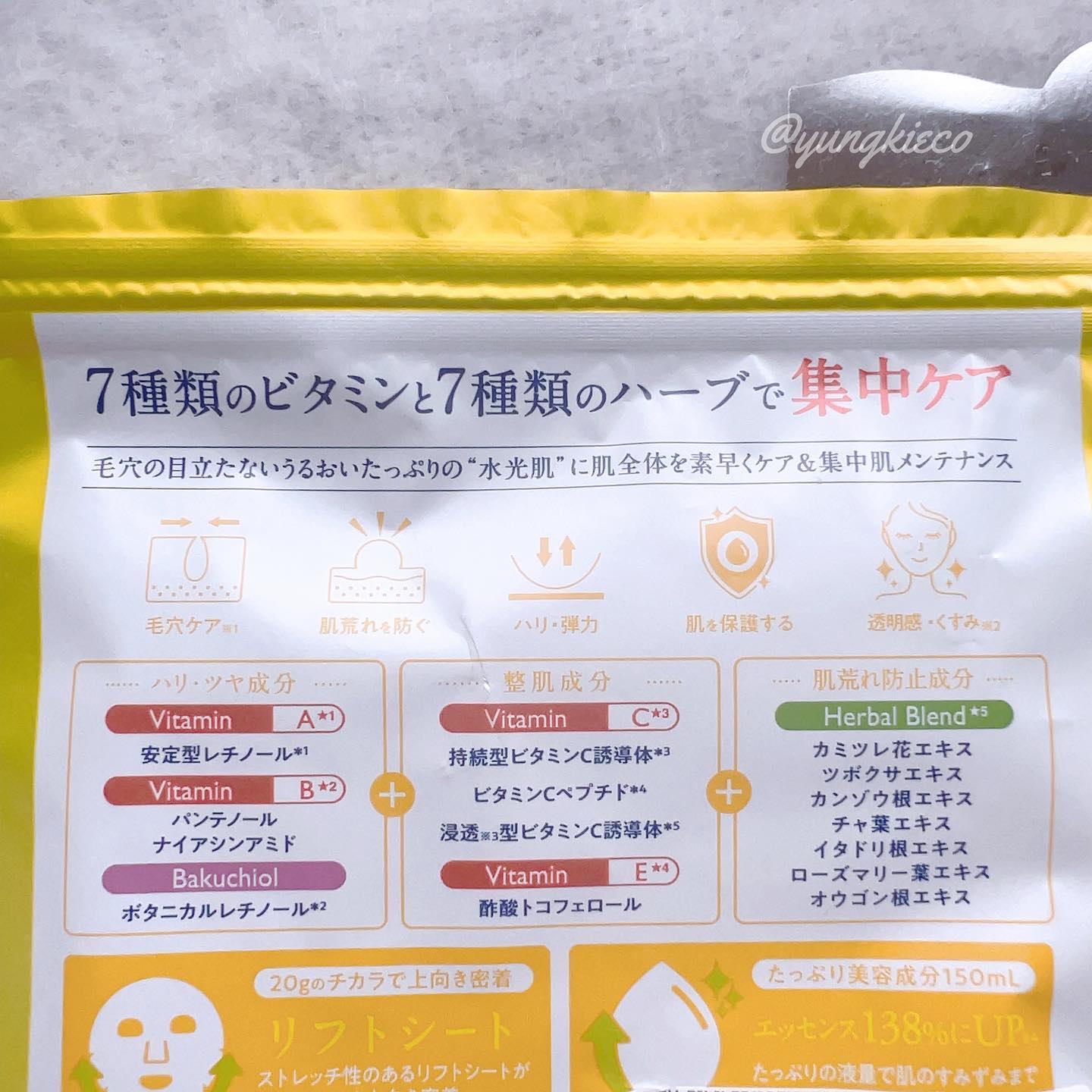 - <7枚入> 水、グリセリン、BG、アスコルビルグルコシド、ミリスチル3-グリセリルアスコルビン酸、アスコルビルメチルカルボニルペンタぺプチド-72-トリ-t-ブチルトリプトファナミド、バクチオール、バルミチン酸レチノール、ナイアシンアミド、パンテノール、ツボクサエキス、オウゴン根エキス、イタドリ根エキス、カンゾウ根エキス、チャ葉エキス、ローズマリー葉エキス、カミツレ花エキス、ポリクオタニウム-51、グリコシルトレハロース、加水分解水添デンプン、グリセリルグルコシド、酢酸トコフェロール、ピーナッツ油、水添レシチン、PEG-60水添ヒマシ油、PEG-40水添ヒマシ油、キサンタンガム、EDTA-2Na、クエン酸、クエン酸Na、フェノキシエタノール、メチルパラベン <28枚入> 水、グリセリン、BG、アスコルビルグルコシド、ミリスチル3-グリセリルアスコルビン酸、アスコルビルメチルカルボニルペンタぺプチド-72-トリ-t-ブチルトリプトファナミド、バクチオール、バルミチン酸レチノール、ナイアシンアミド、パンテノール、ツボクサエキス、オウゴン根エキス、イタドリ根エキス、カンゾウ根エキス、チャ葉エキス、ローズマリー葉エキス、カミツレ花エキス、ポリクオタニウム-51、グリコシルトレハロース、加水分解水添デンプン、グリセリルグルコシド、酢酸トコフェロール、ピーナッツ油、水添レシチン、PEG-60水添ヒマシ油、PEG-40水添ヒマシ油、キサンタンガム、EDTA-2Na、クエン酸、クエン酸Na、フェノキシエタノール、メチルパラベン
