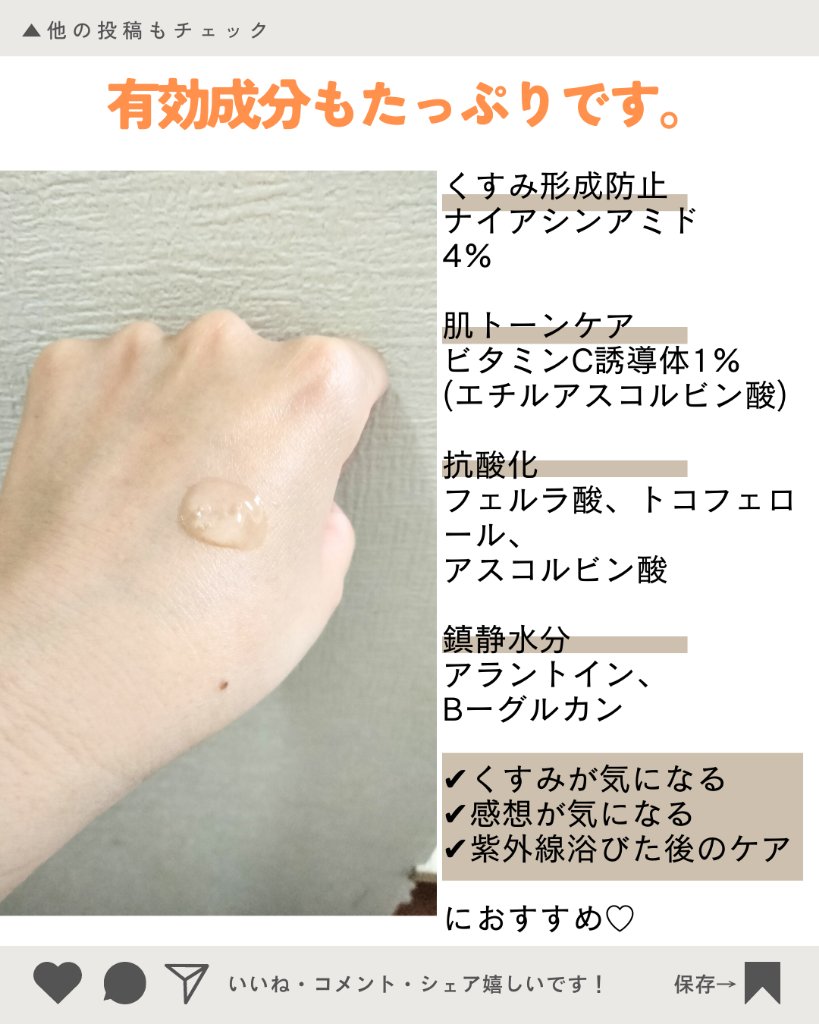 ナイアシンアミド15% 高濃度配合でメラニン生成を防止、徹底メラニンケア✨ まだ肌表面に出てきてない美白、くすみ、ハリ、肌荒れケアなど万能に働いてくれます💛 ちょっと、とろみのあるテクスチャなのですが、伸ばしてみるとサラっとした感じ。 すっと肌に浸透してくれます💛ベタつかないのに、しっかり肌の内側が潤う感覚のセラム。 高濃度なのですが私は刺激は全く感じませんでした✨ ナイアシンアミドも高濃度なのに価格もお手頃1,990円!