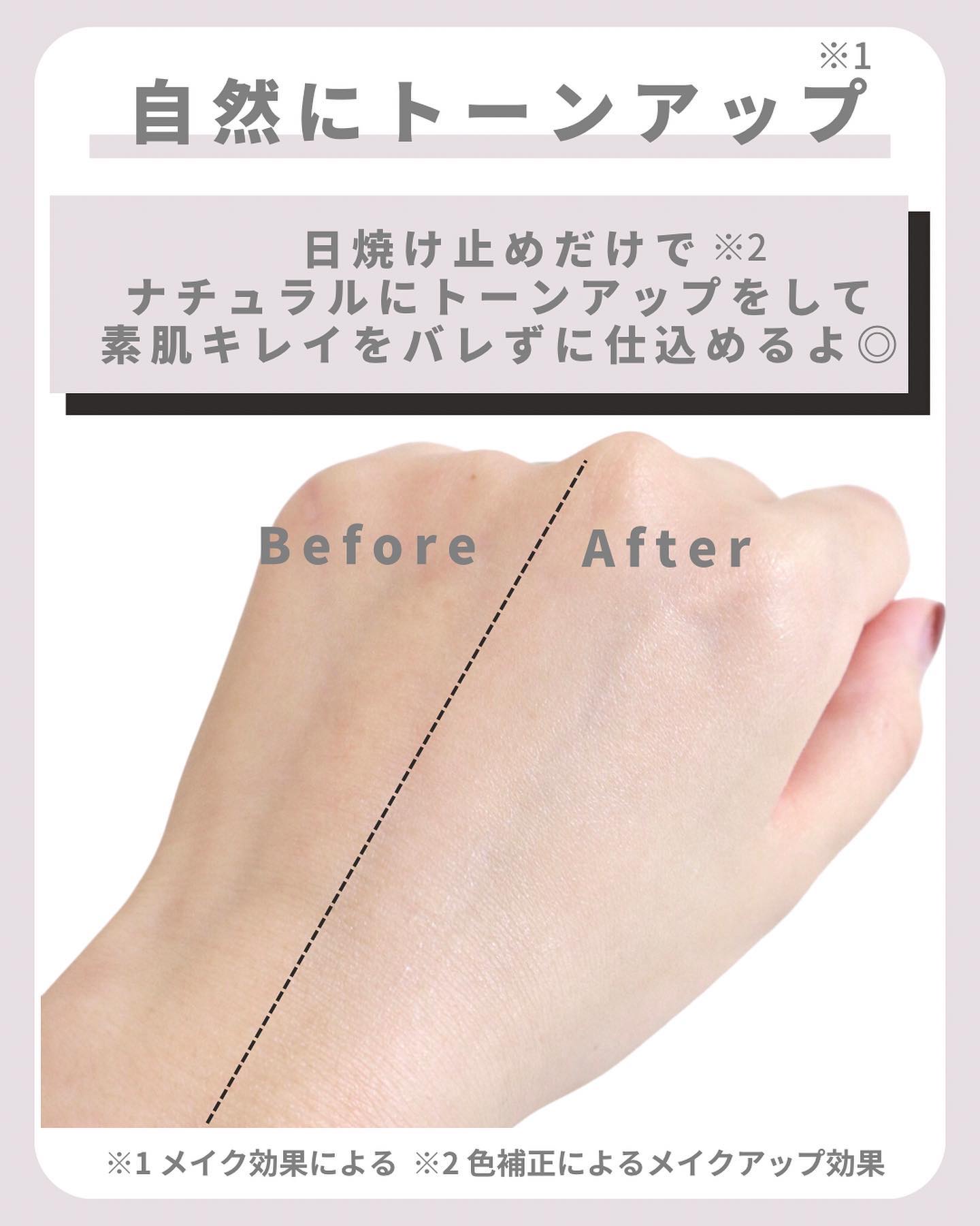 特徴・SPF50+、PA++++・なりたい肌印象やその日の気分によって選べる、5色のカラーバリエーション・汗や水に強いウォータープルーフ・石けんや洗顔料で落とせる 使ってみて分かったこと・他の色と組み合わせて使うことで、より自分に合わせた色補正ができていいなと思った・匂いはそんなに気にならなかった(普通の日焼け止めの方が匂いがしない)・少し肌の表面がベタッとする→乾燥肌にはいいかも! 日焼け止め効果が高いだけではなく、色補正もできるところがとても良い!! それに、ウォータープルーフでありながらも、石鹸や洗顔料でも落とせるのも良い!! 私自身、比較的肌が弱いんですけど、ヒリヒリしたとか肌が荒れたとかは一切なかったので、敏感肌の方でも安心して使えると思いました!