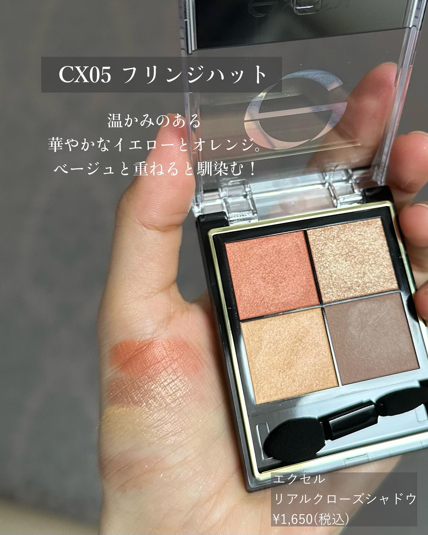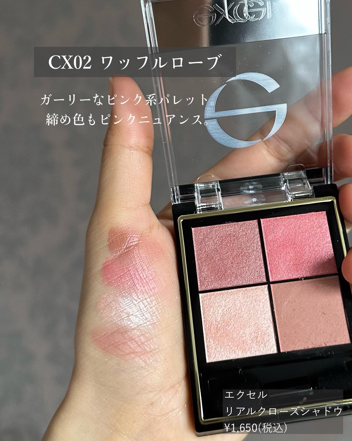 究極のプチプラ高見えシャドウ excel リアルクローズシャドウ ¥1650(税込) CX08クオーツリング ローズ、ベージュ、ブラウンで作るグラデーションが美しい。この3色だけを使うと大人っぽい仕上がりで、元々このシャドウが持つリッチな艶とマッチしてデパコスのような高級感があります。 異彩を放つ右上のコーラル。韓国コスメのようなポップさも感じる粒感ラメで、トッピングすると印象ががらっと変わります。